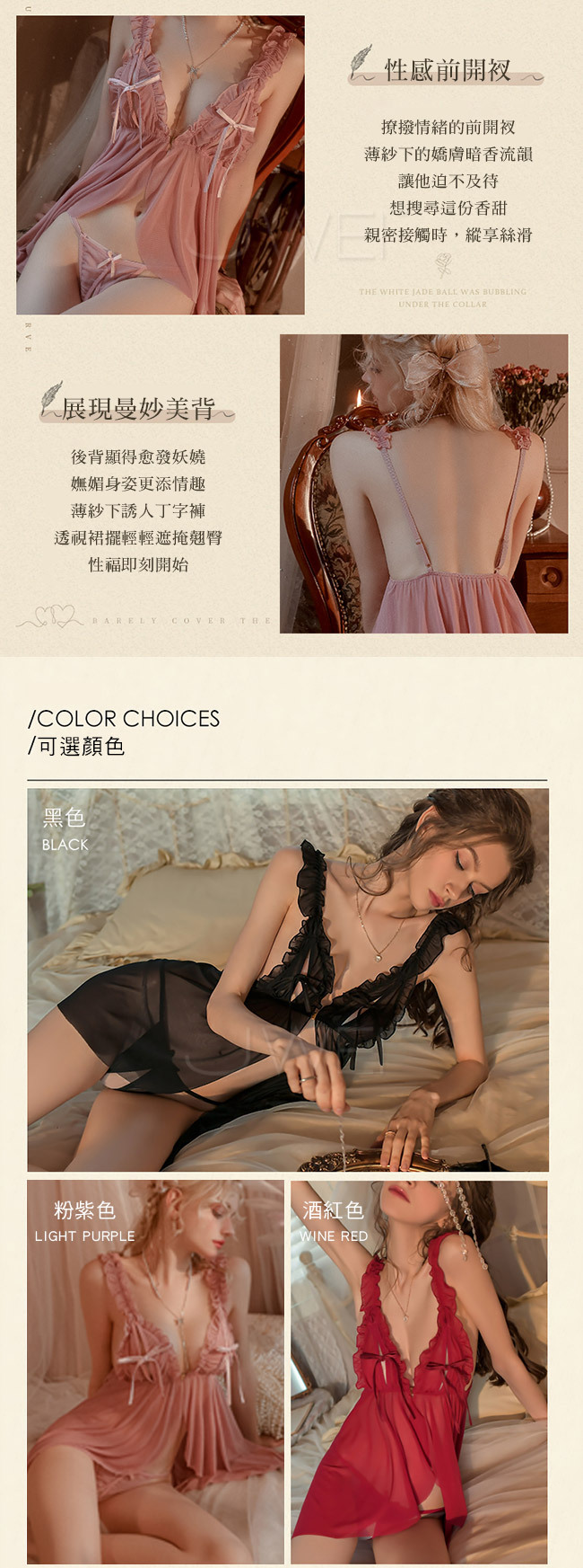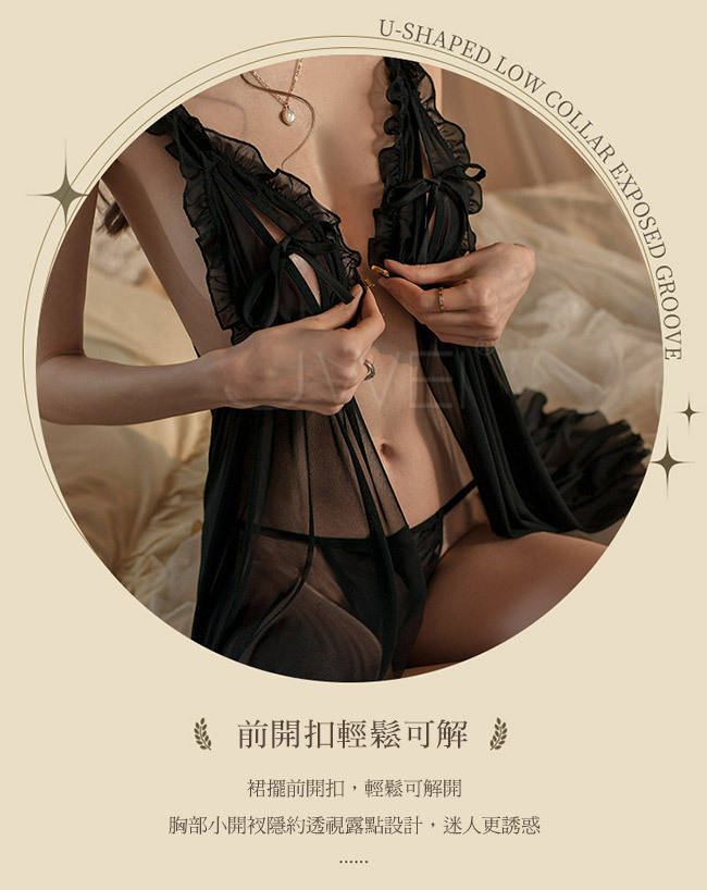 ◇◆艾莉絲之吻.誘惑透視前開衩露背浪漫睡裙2件組(黑色)◆◇