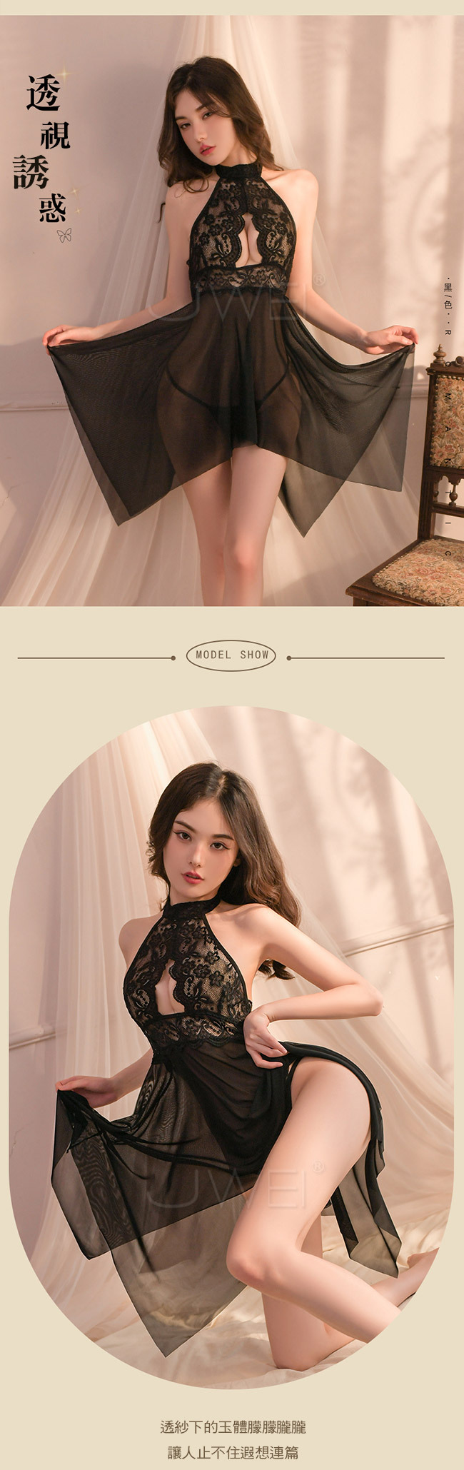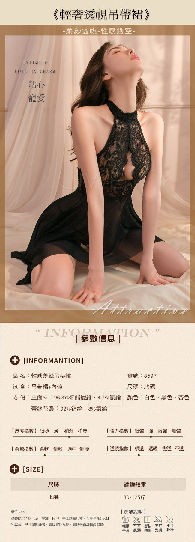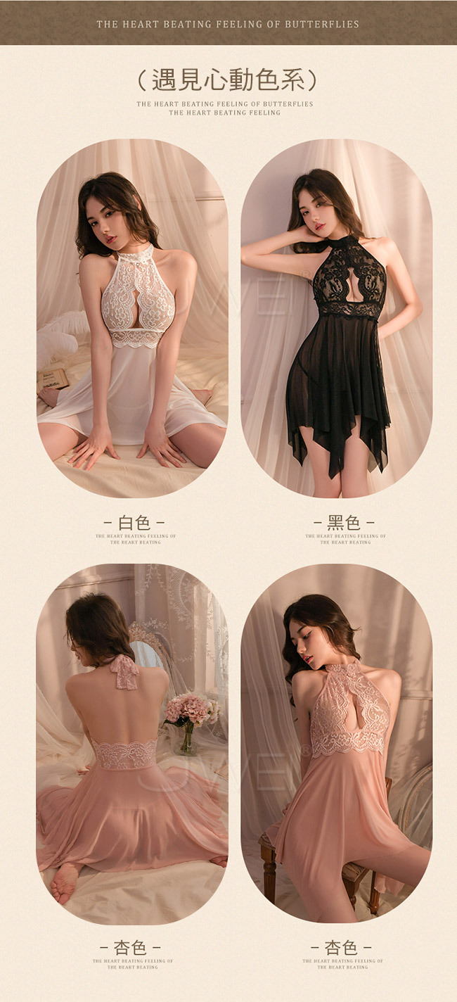 ◇◆甜美雅韻.性感鏤空柔紗透視蕾絲掛脖吊帶裙2件組(杏色)◆◇