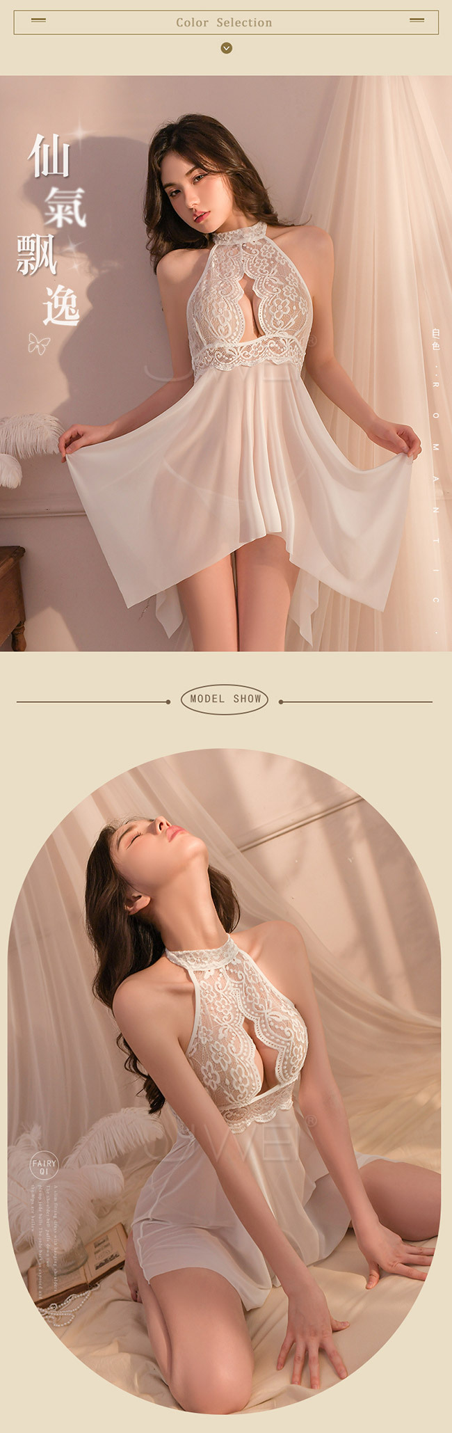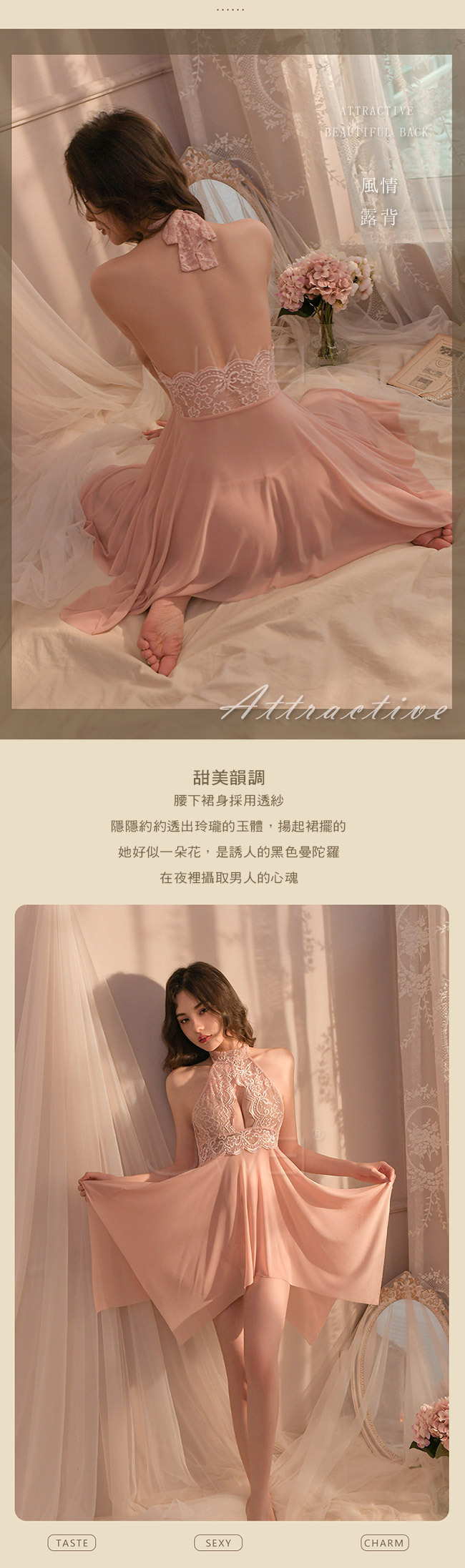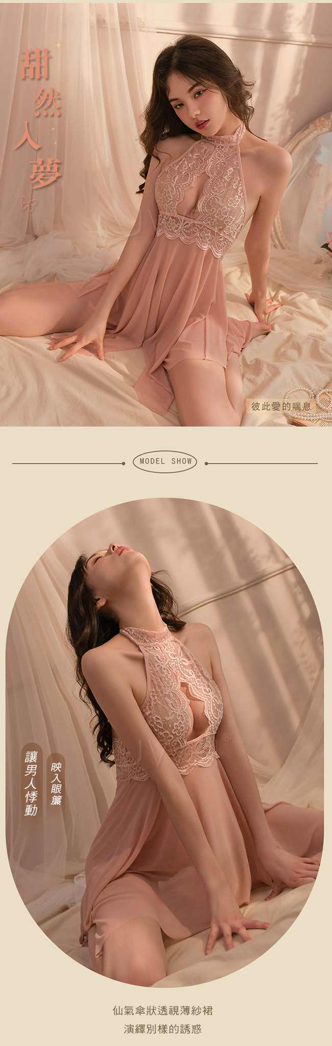 甜美雅韻.性感鏤空柔紗透視蕾絲掛脖吊帶裙2件組(杏色)