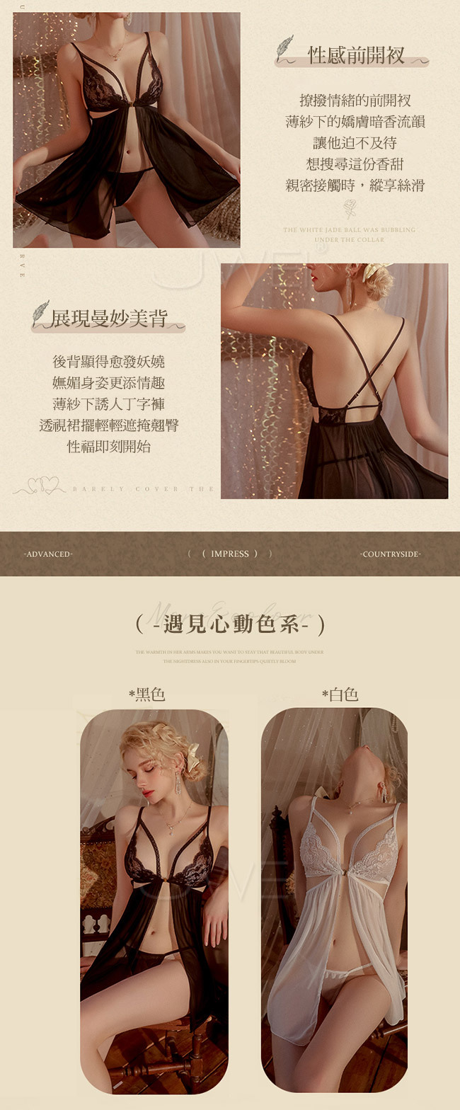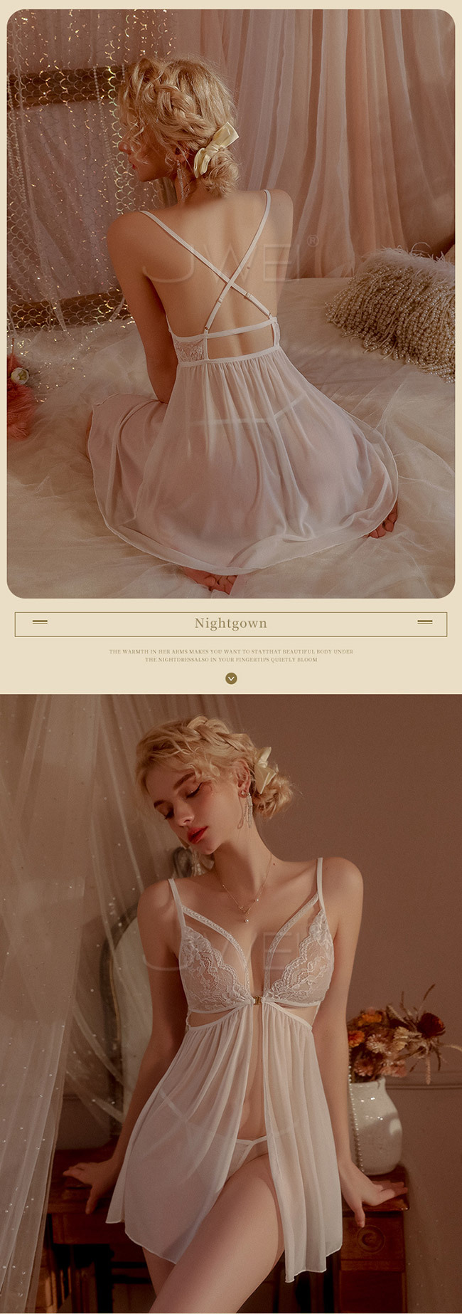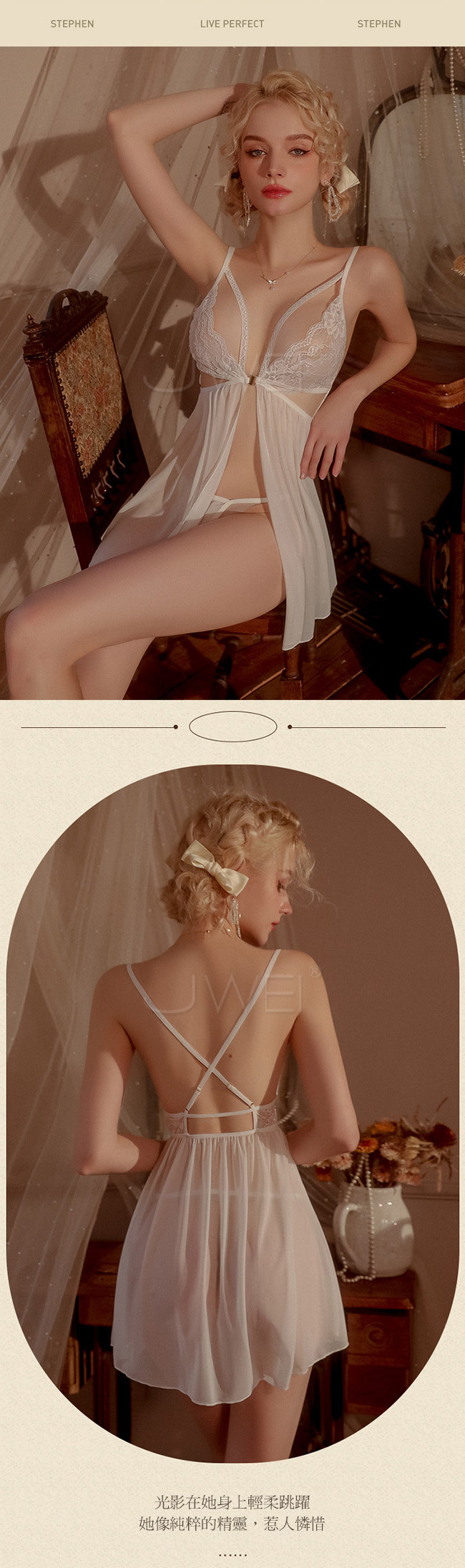 馨香麗影.性感透紗露溝前開衩睡裙2件組(白色)