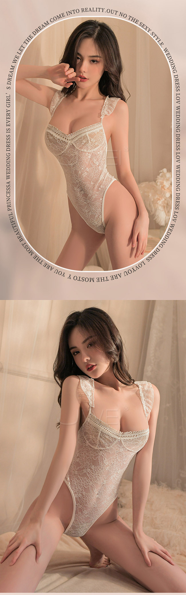 她穿上一襲蕾絲連體衣