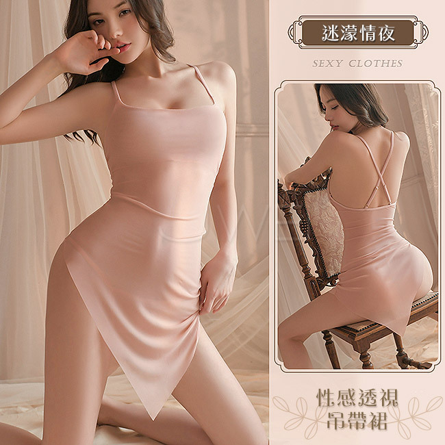 迷濛情夜.性感露溝側邊高開衩吊帶裙2件組(杏色)