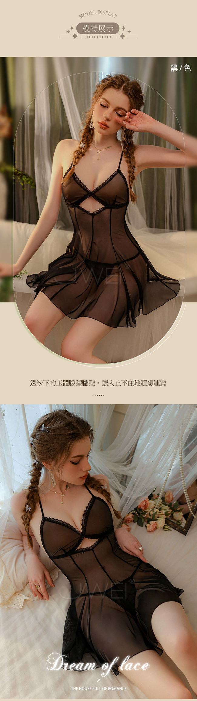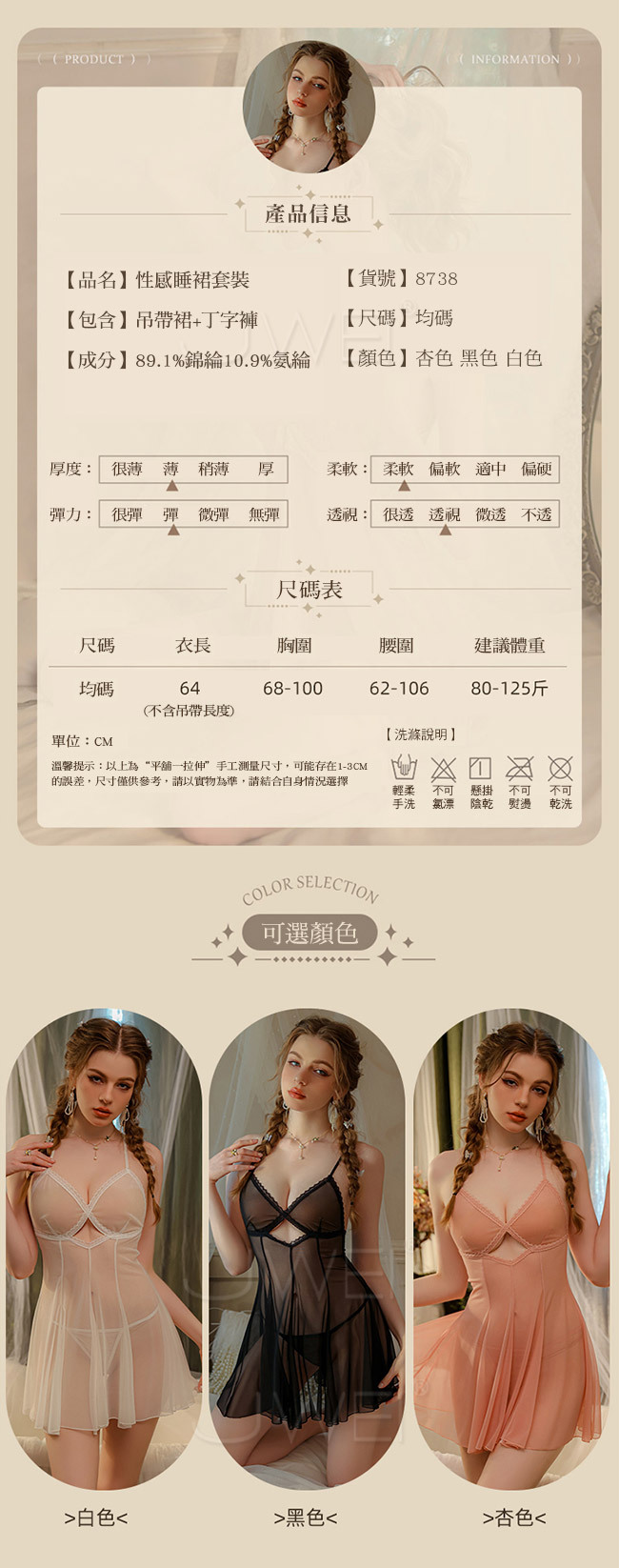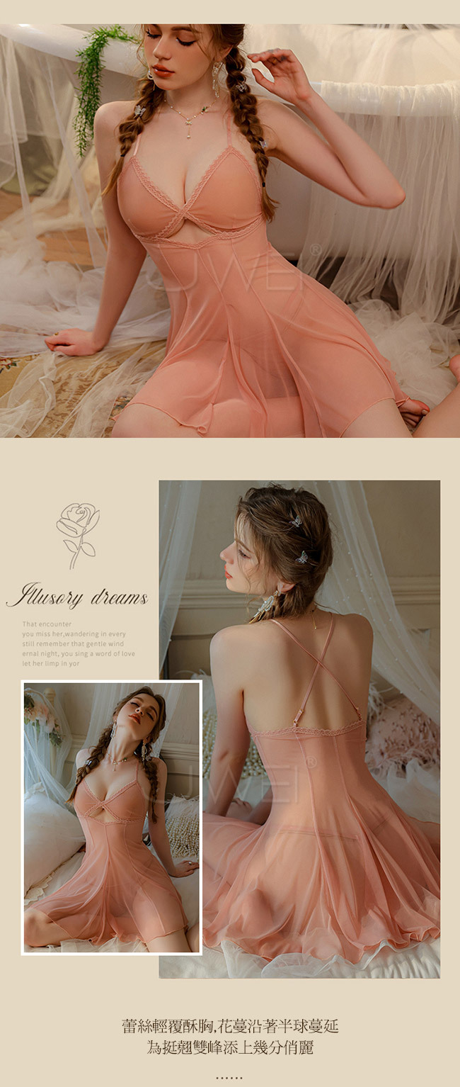 迷離奇夢.性感透視撩撥吊帶紗裙2件組(杏色)