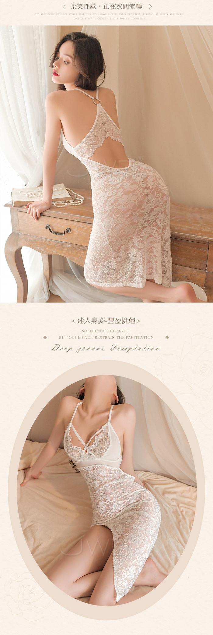 偷心威士忌.性感蕾絲透膚腰間側高開衩連身裙2件組(白色)