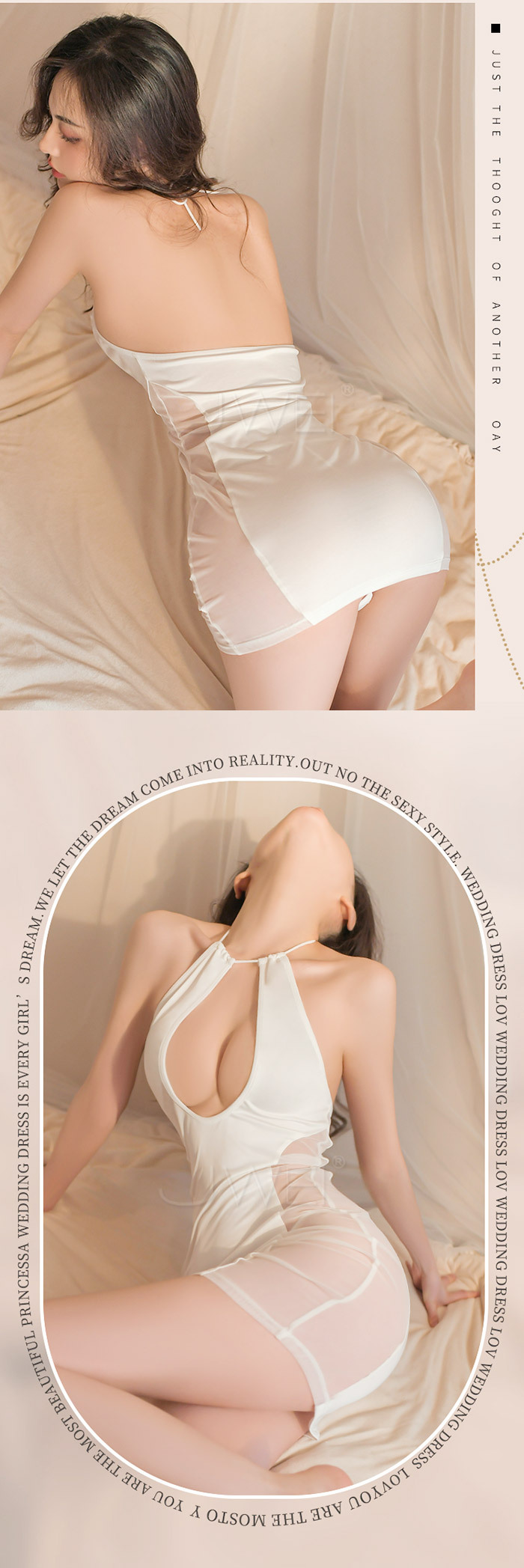 嫵媚情調.性感深V掛脖側腰透視包臀連身裙2件組(白色)