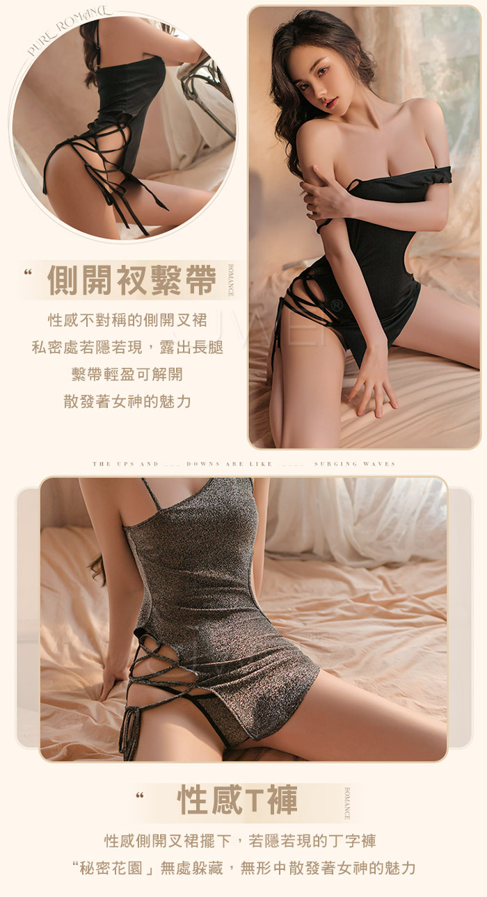 閃耀風尚.性感露溝側開衩繫帶不規則連身裙2件組(粉銀)