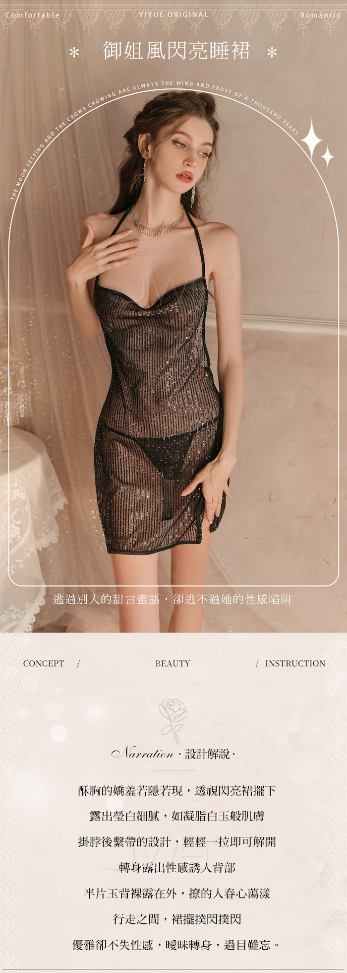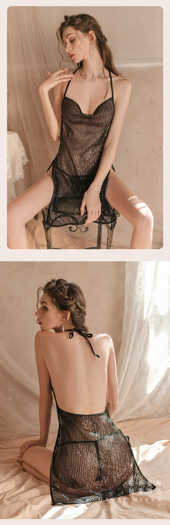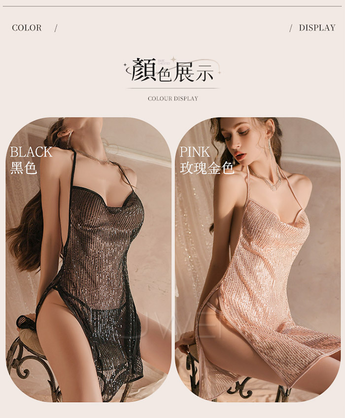 寵愛浪漫.性感閃光掛脖露背側開衩連身裙2件組(黑色)