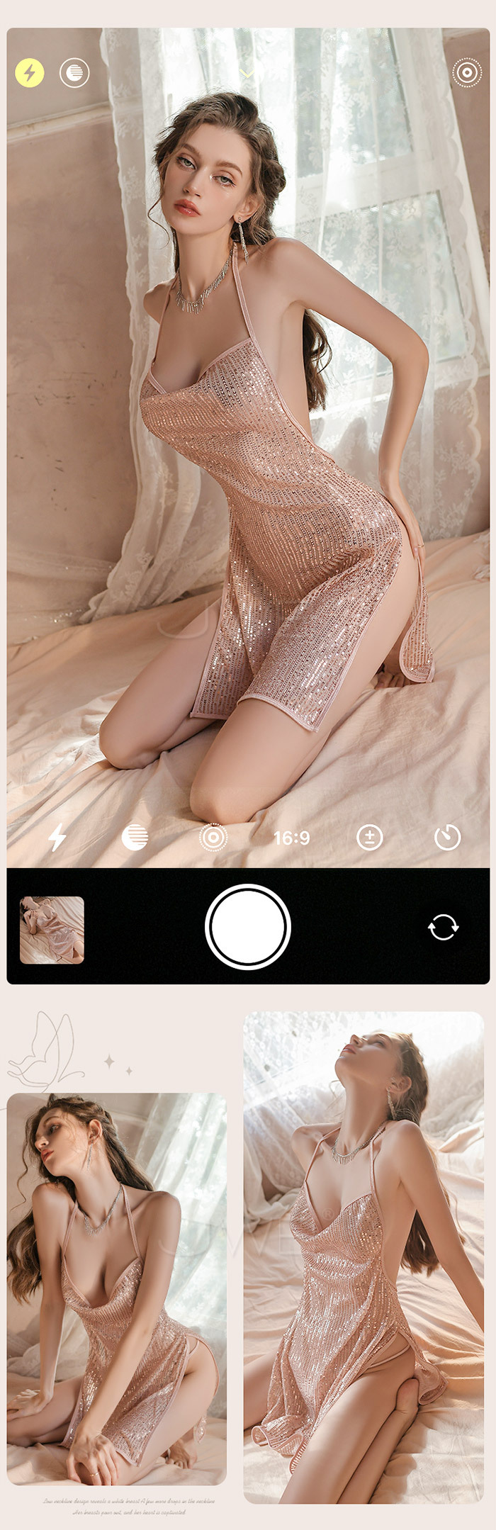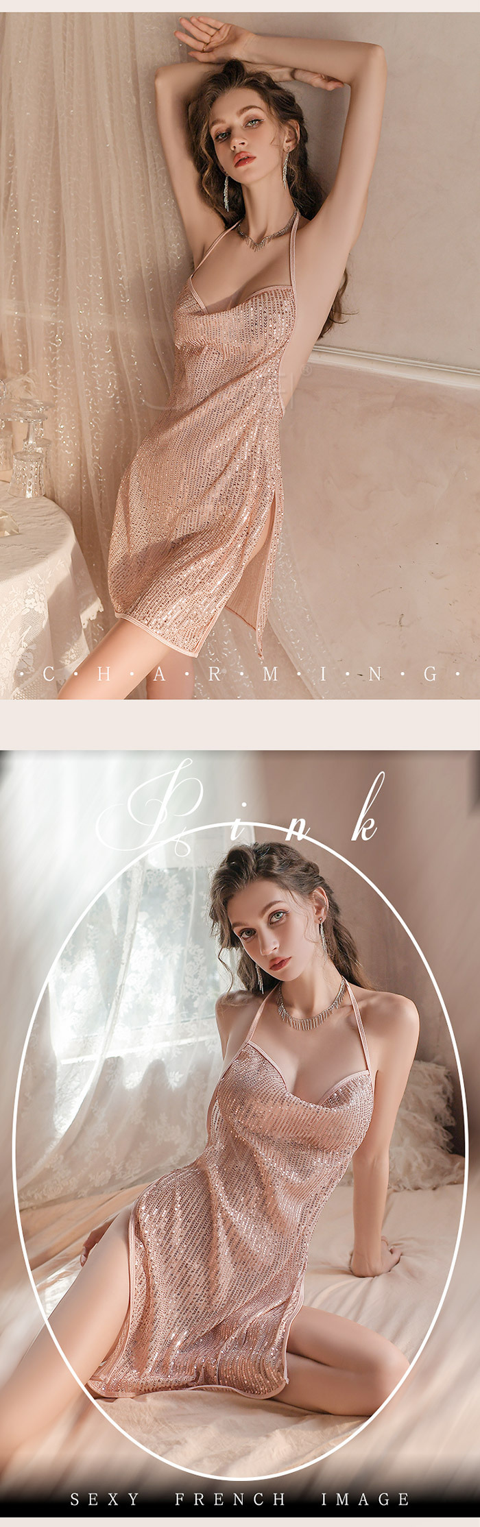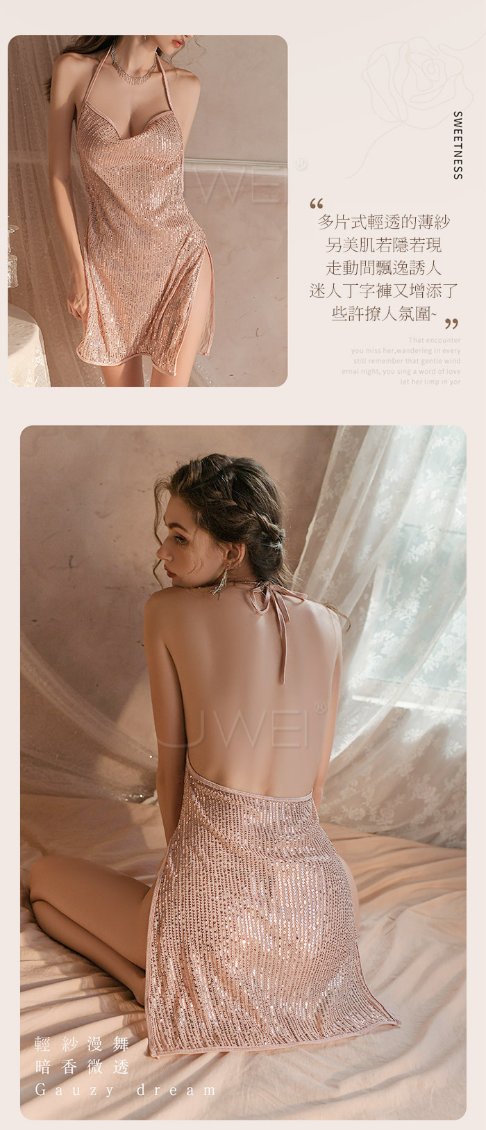 寵愛浪漫.性感閃光掛脖露背側開衩連身裙2件組(黑色)