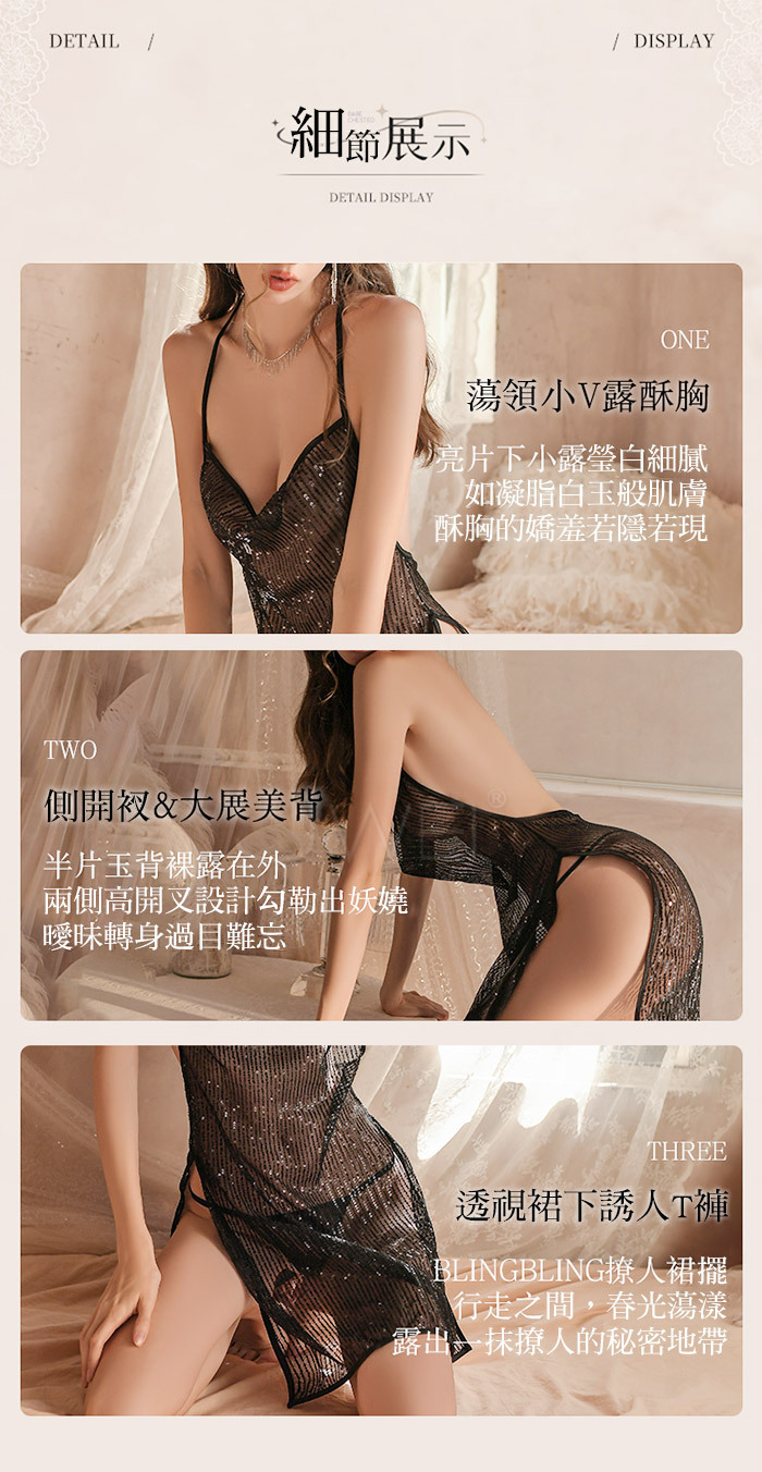 ◇◆寵愛浪漫.性感閃光掛脖露背側開衩連身裙(黑)◆◇