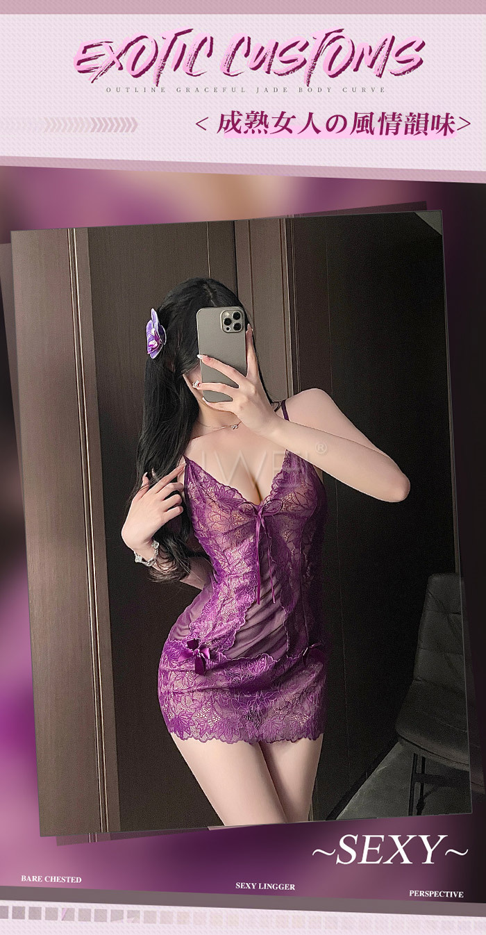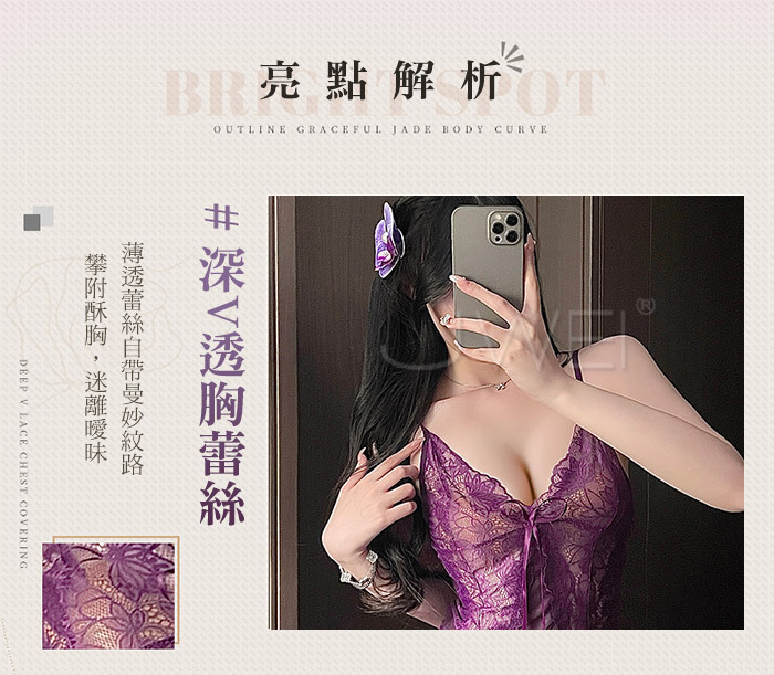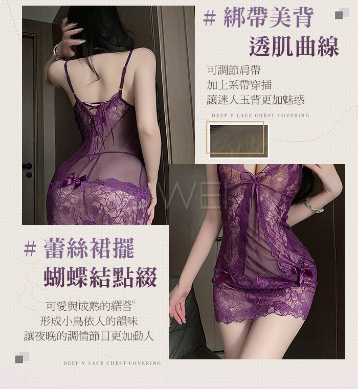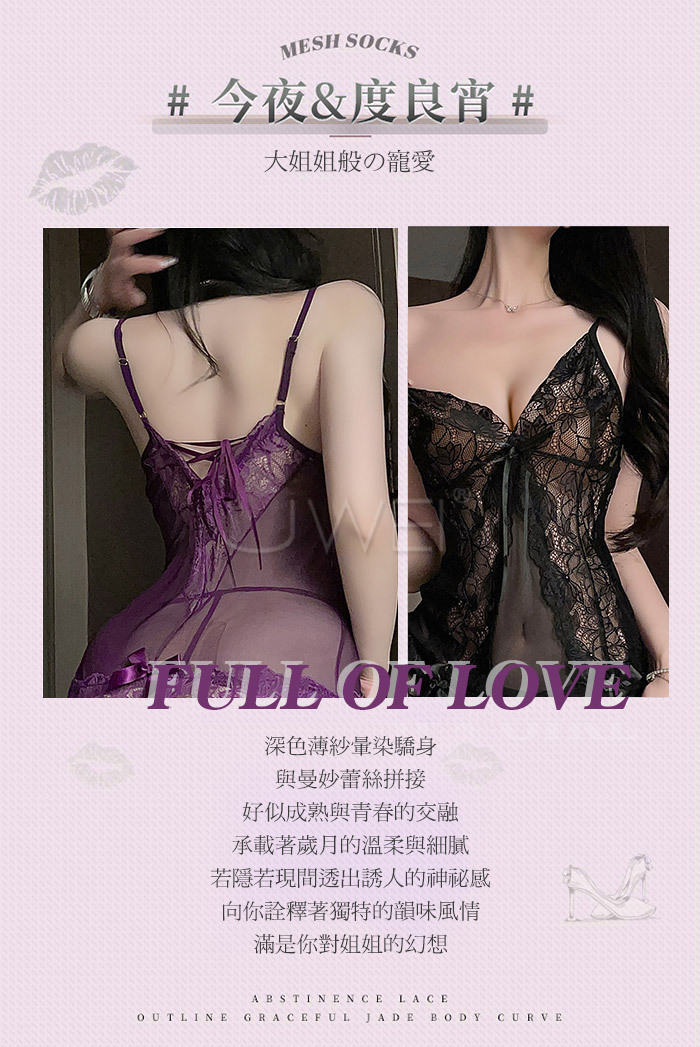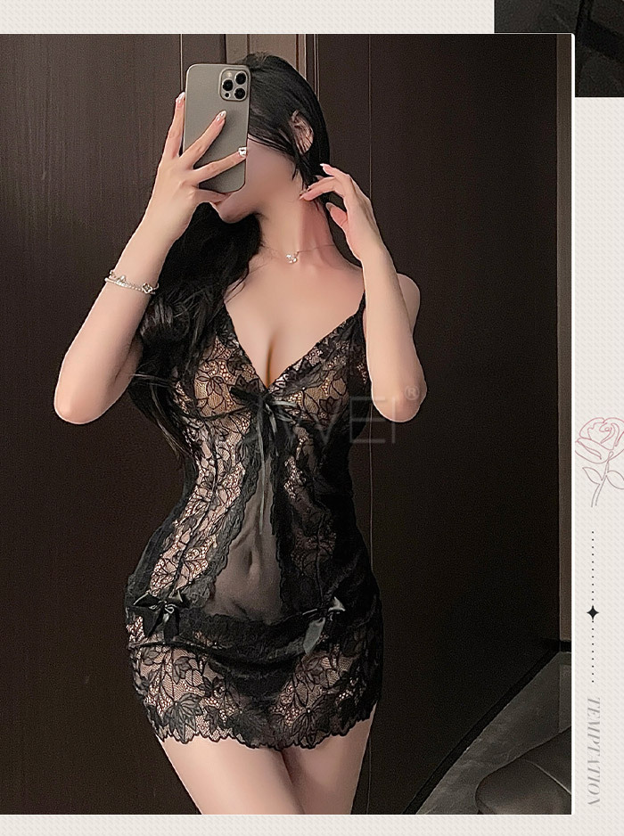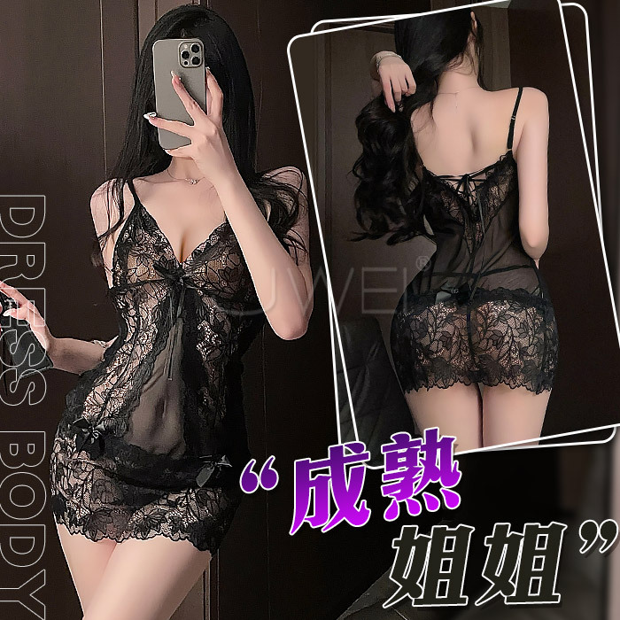 成熟姐姐.性感深V透胸蕾絲裙擺連身睡裙-黑色