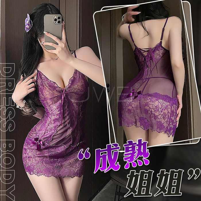 成熟姐姐.性感深V透胸蕾絲裙擺連身睡裙-紫色
