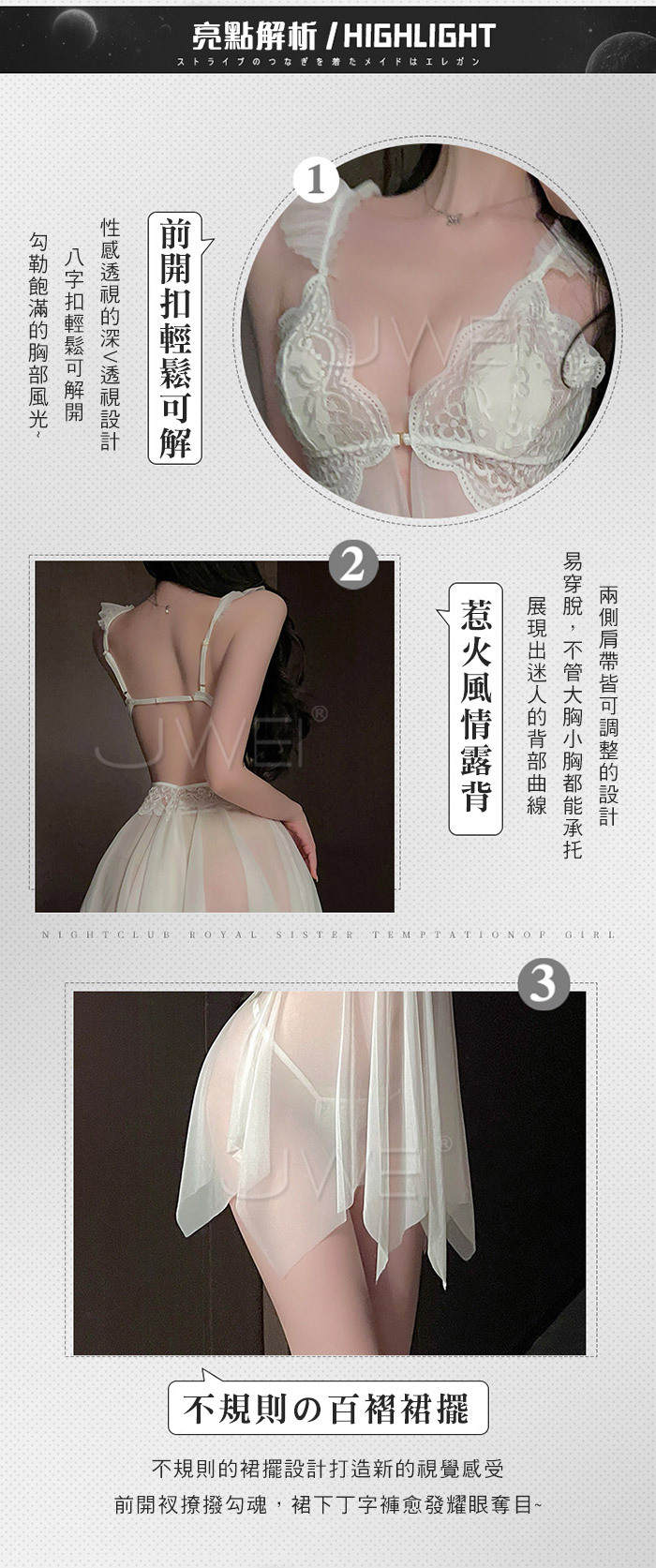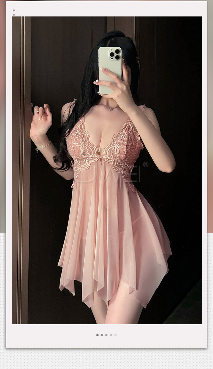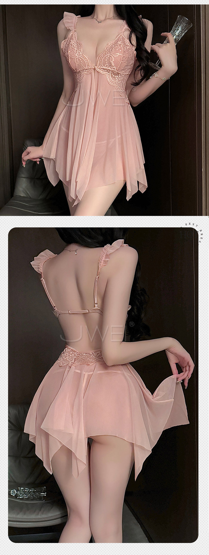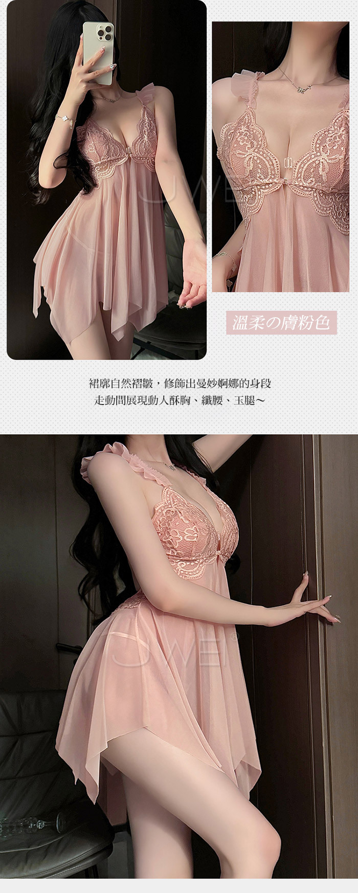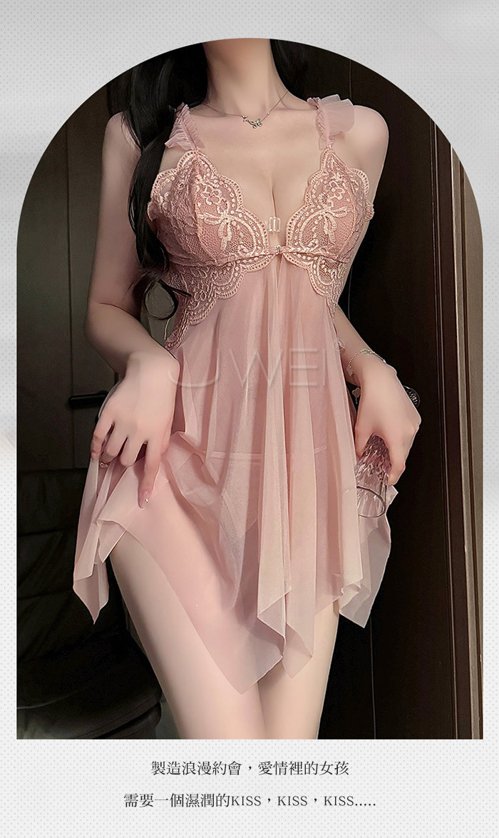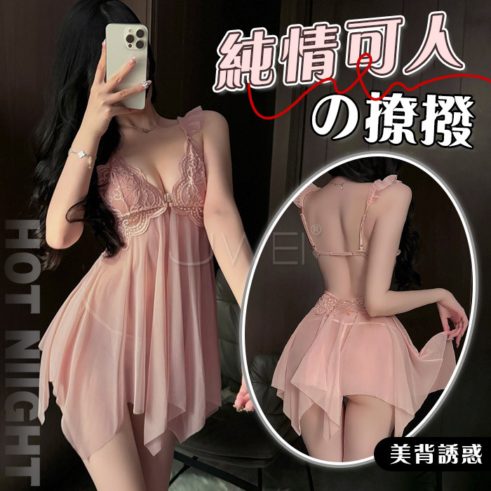 清純可人.惹火露溝美背前開扣輕鬆解透視連身睡裙-膚粉色