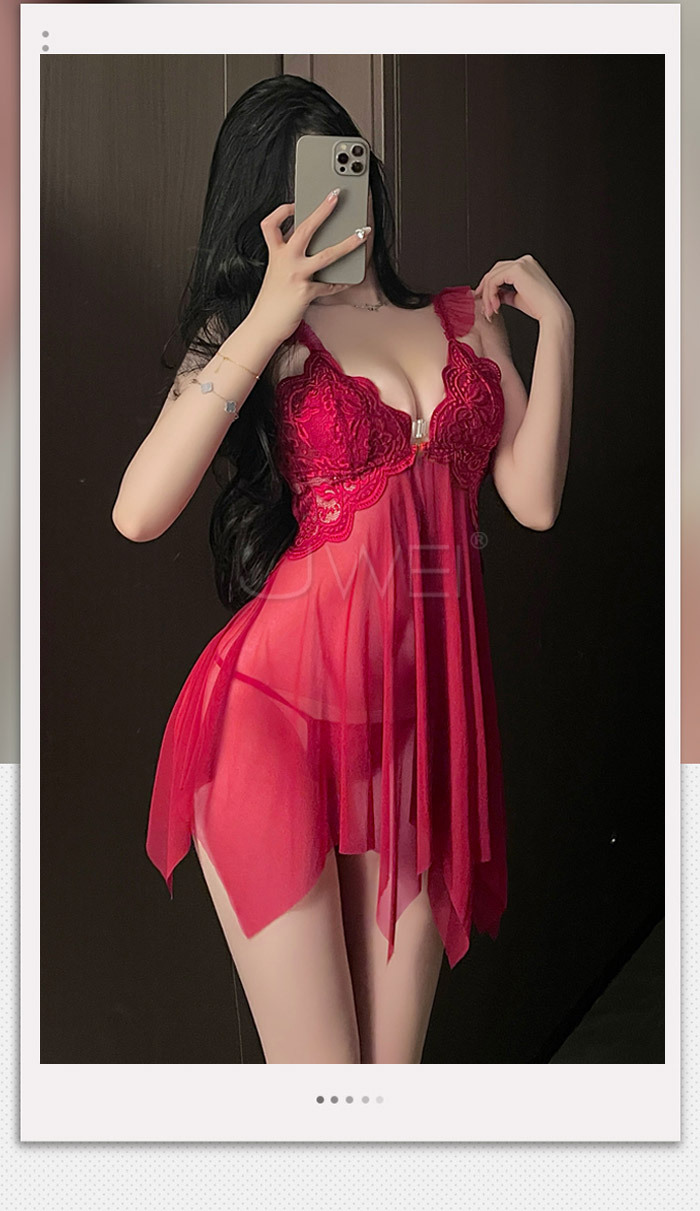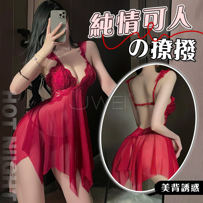 清純可人.惹火露溝美背前開扣輕鬆解透視連身睡裙-酒紅色