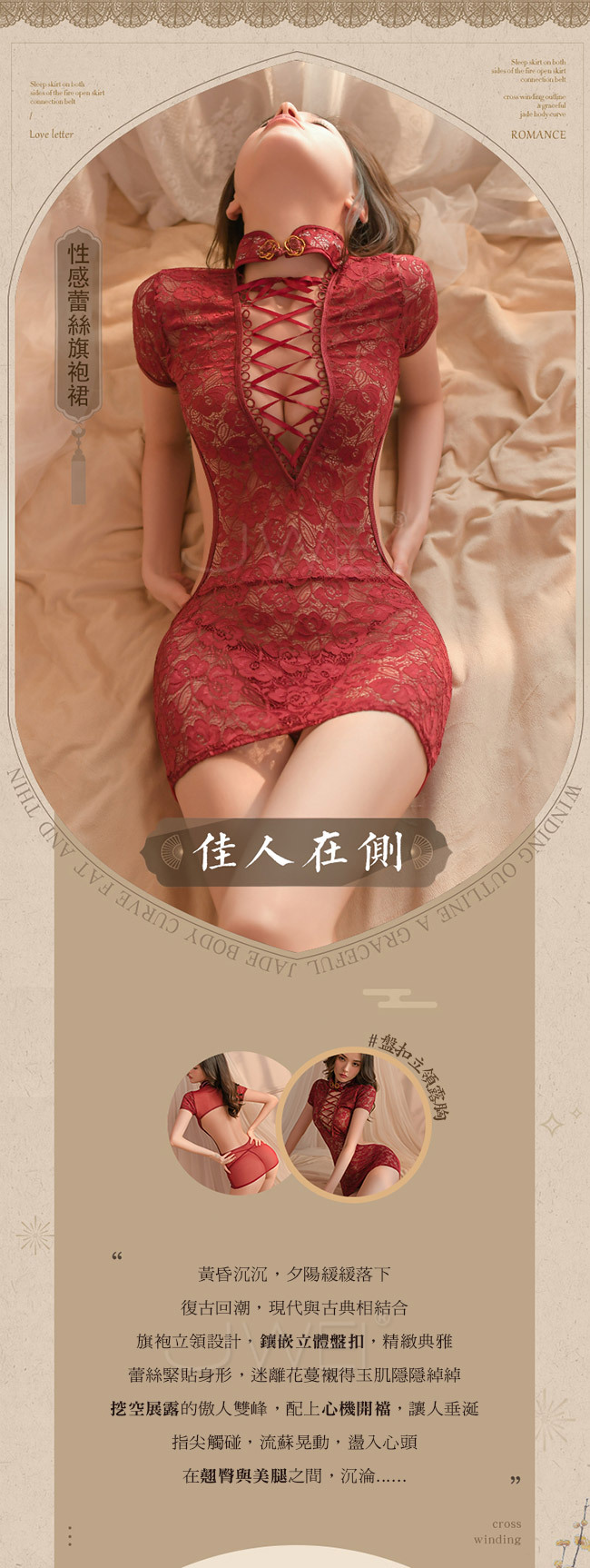 愛意瀰漫.深V交叉綁帶盤扣立領露胸露背蕾絲旗袍2件組(白色)