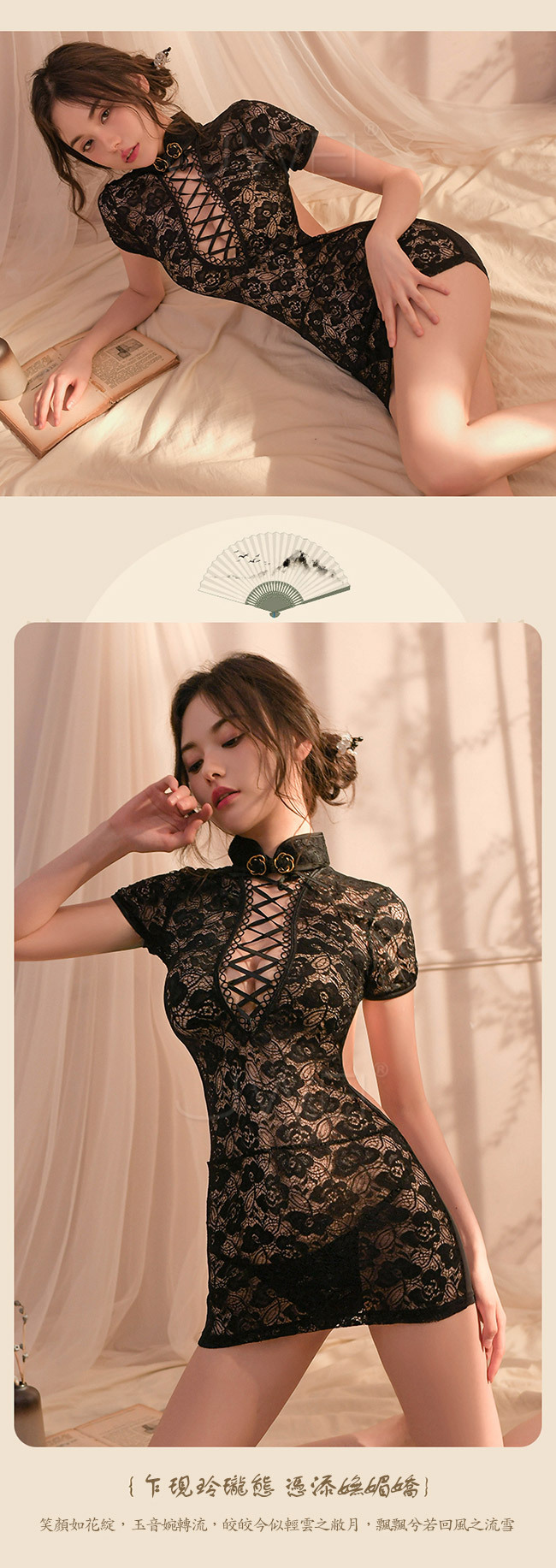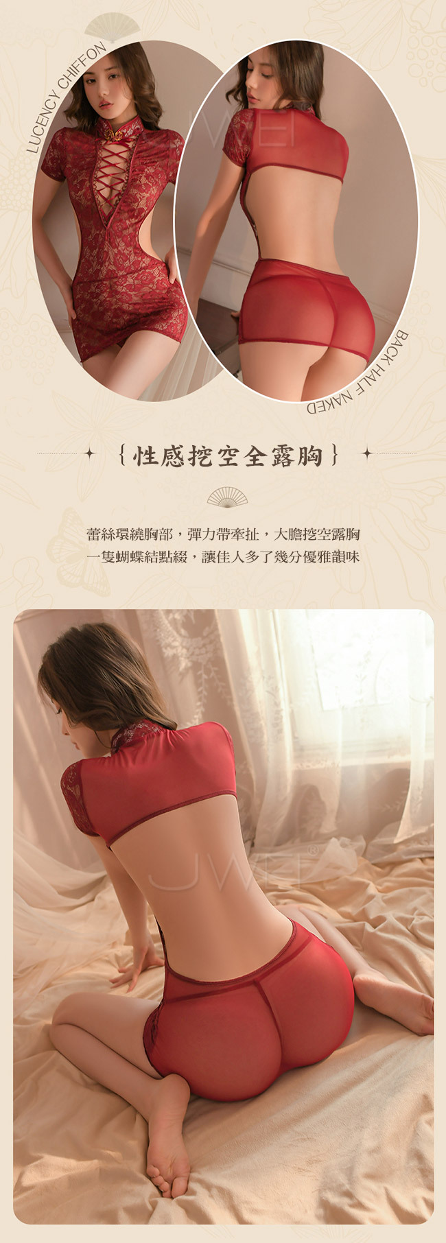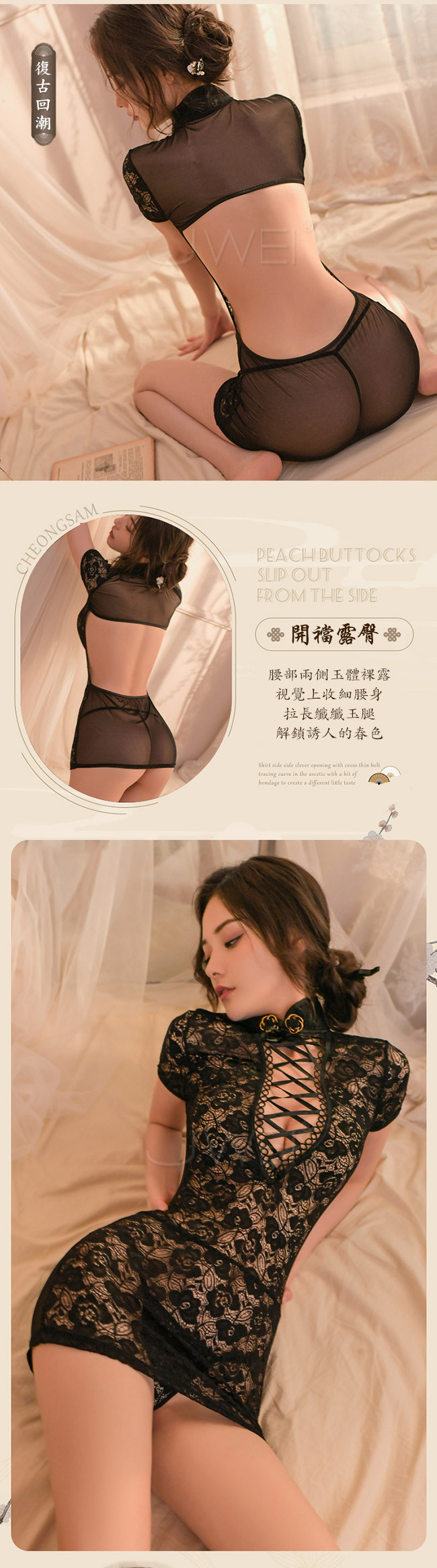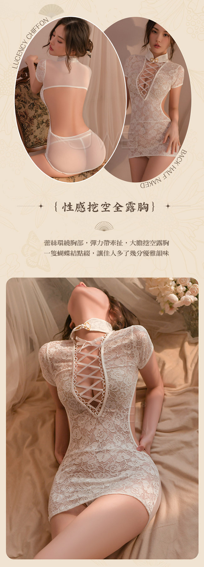 ◇◆愛意瀰漫.深V交叉綁帶盤扣立領露胸露背蕾絲旗袍2件組(白色)◆◇