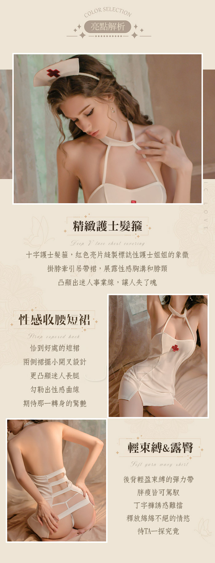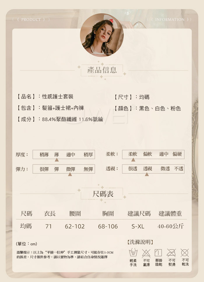 ■內容物:髮箍x1、護士裙x1、T褲x1(長筒絲襪另選購)