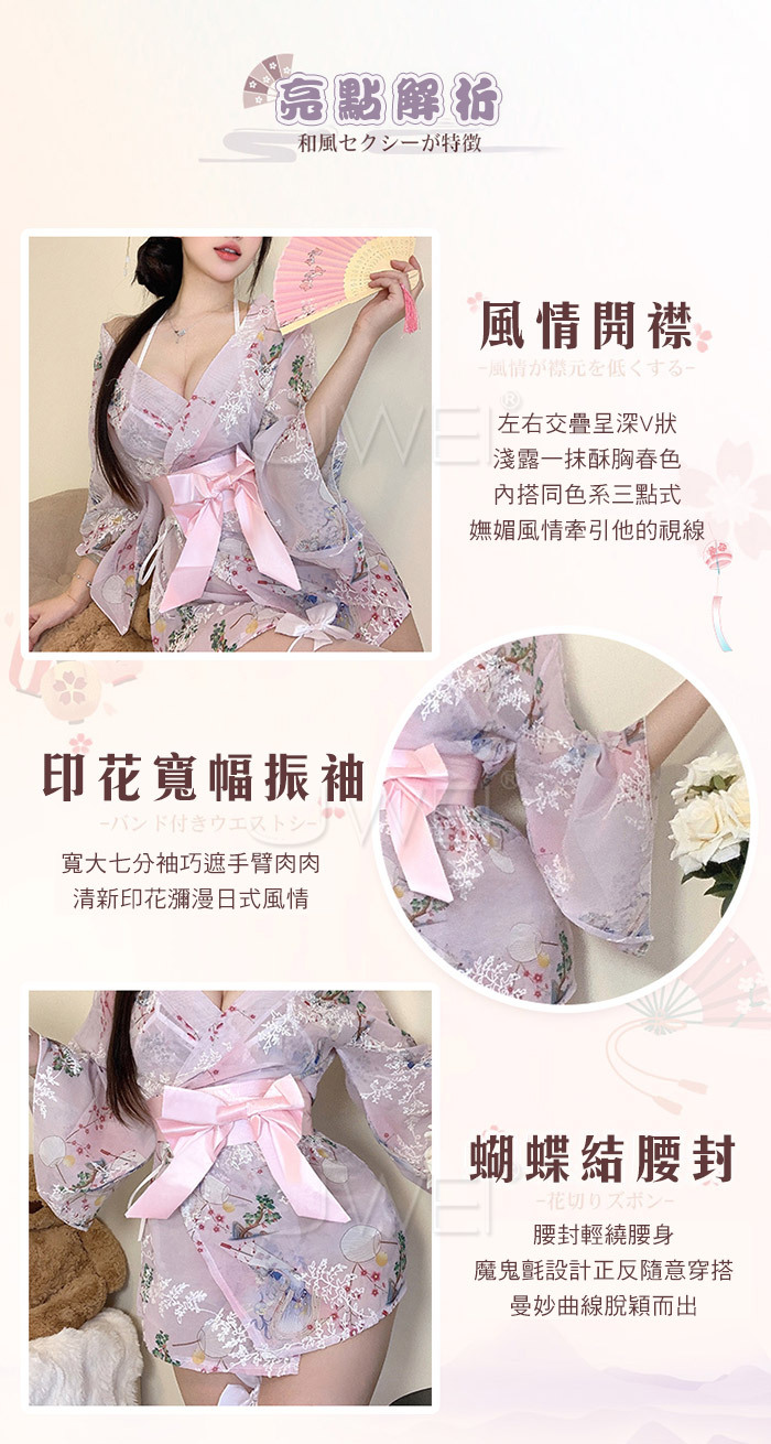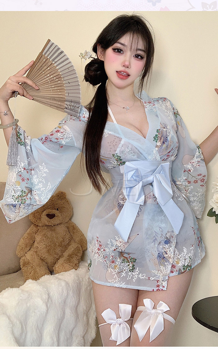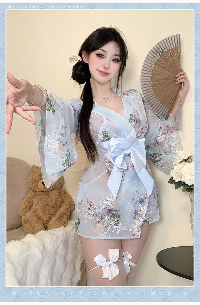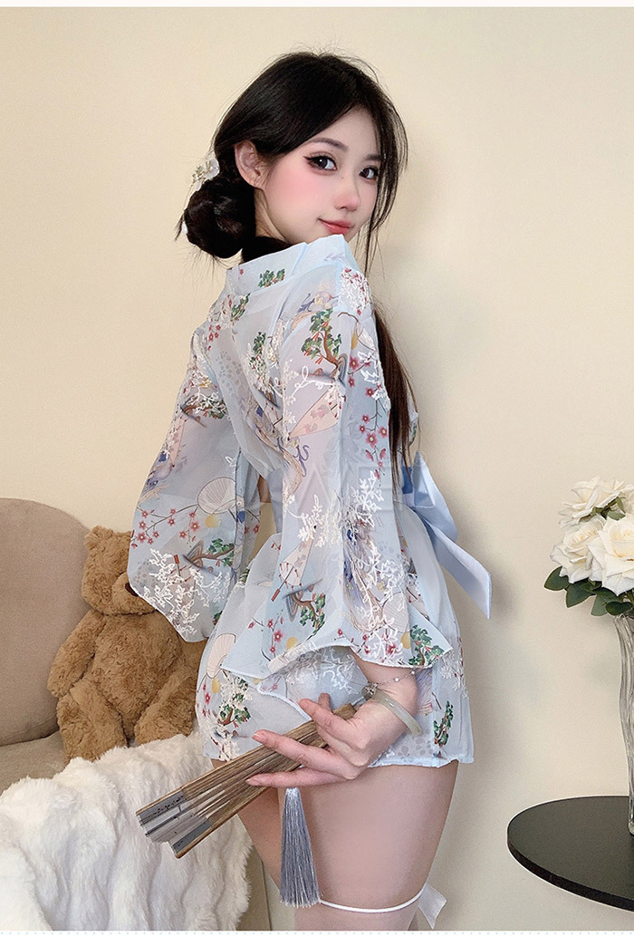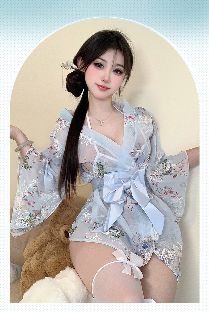 落櫻美姬.純欲日式繡花和服套裝4件套組-淺藍