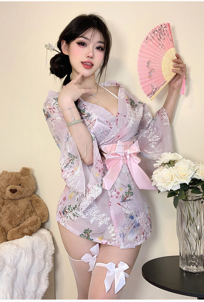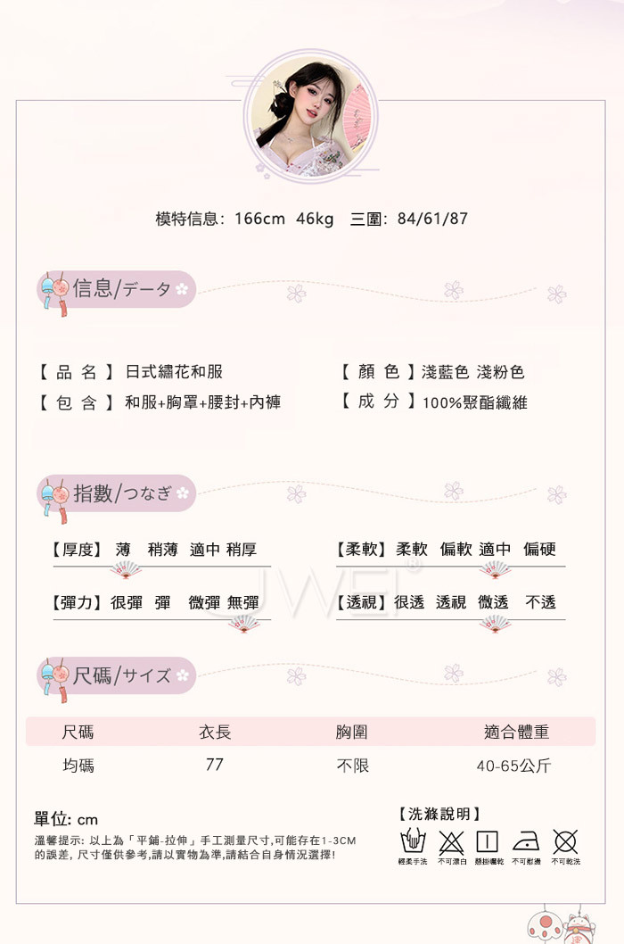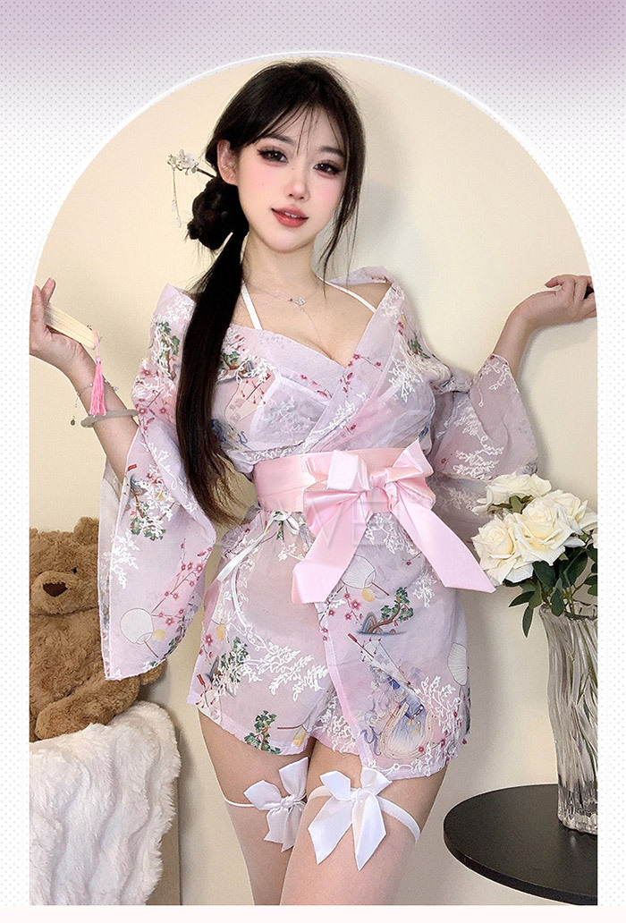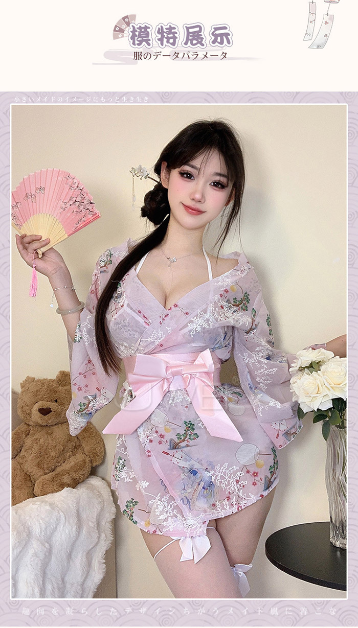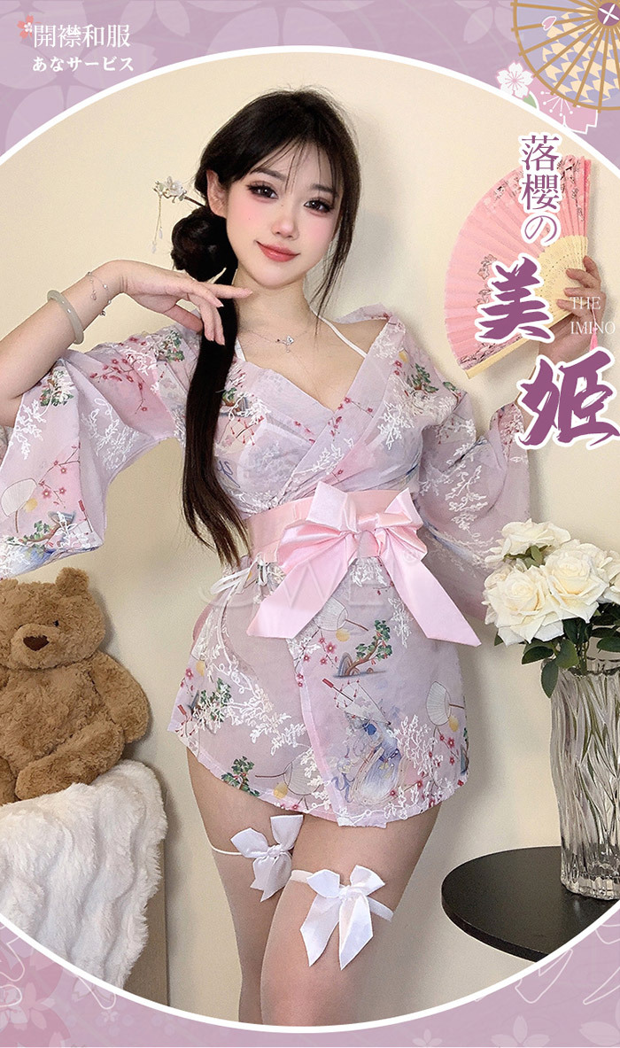 落櫻美姬.純欲日式繡花和服套裝4件套組-淺藍