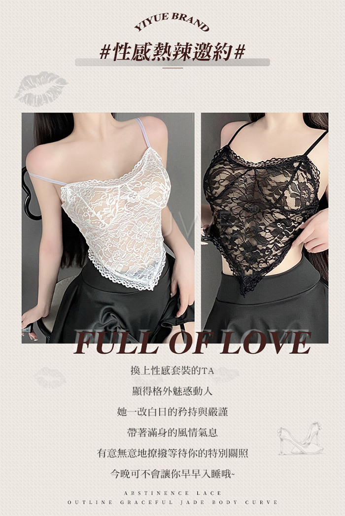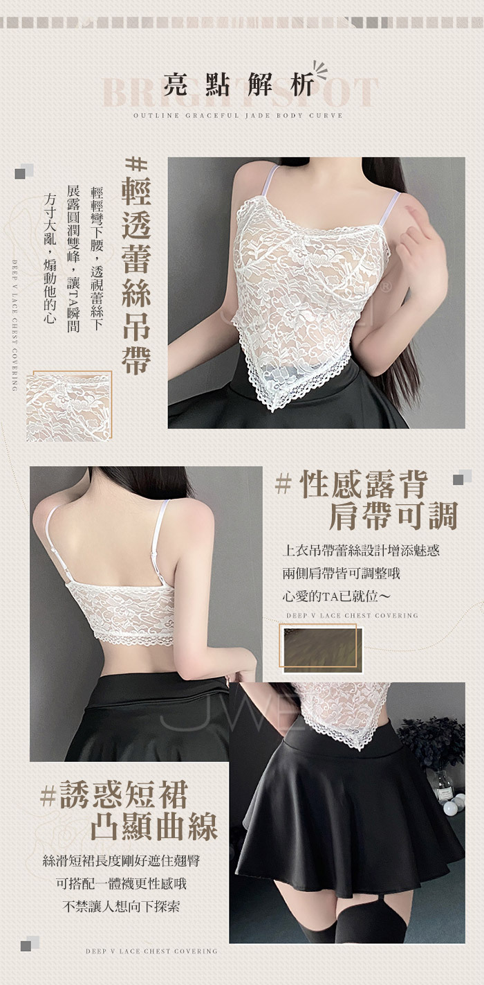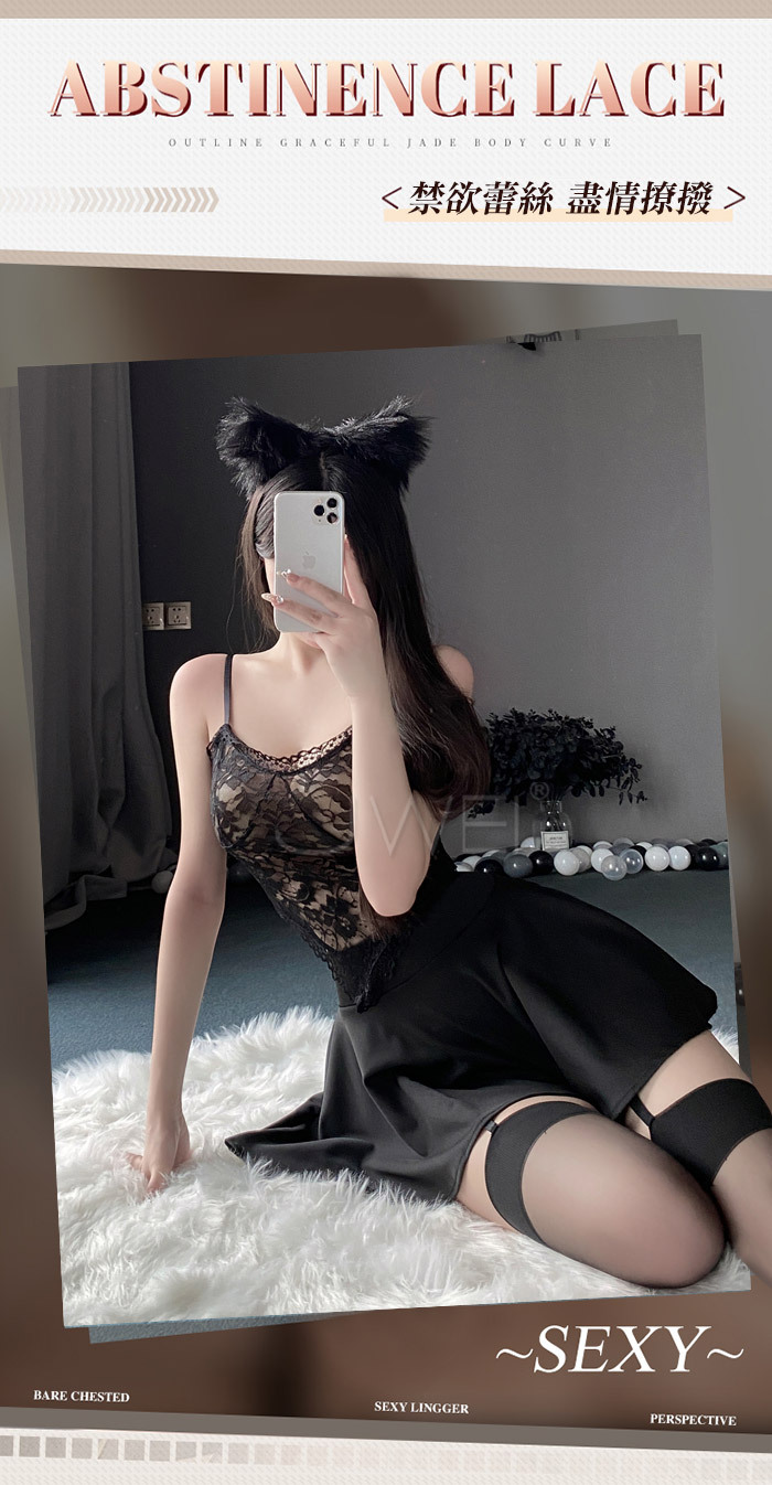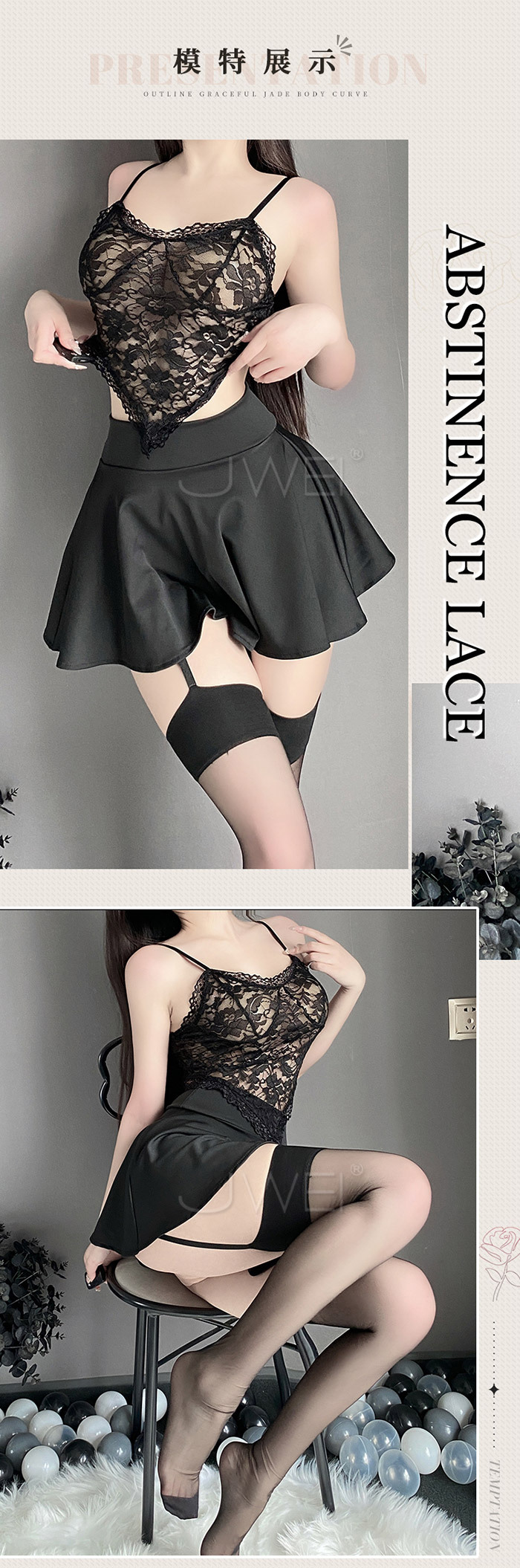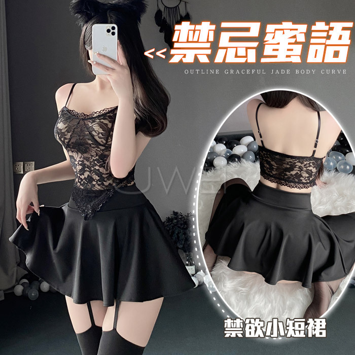 禁忌蜜語.輕透蕾絲迷你小短裙三件套裝-黑色