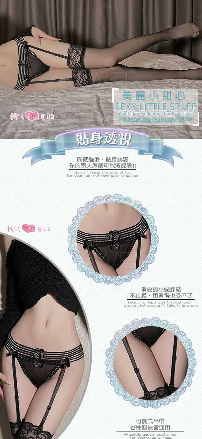 ■內容物:吊襪帶丁字褲x1、大腿蕾絲絲襪x1