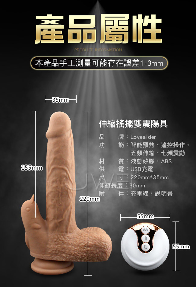 ■特色:5段伸縮、7頻震動、吸盤免提式、仿真造型、恆溫加熱、雙馬達設計、遠端遙控