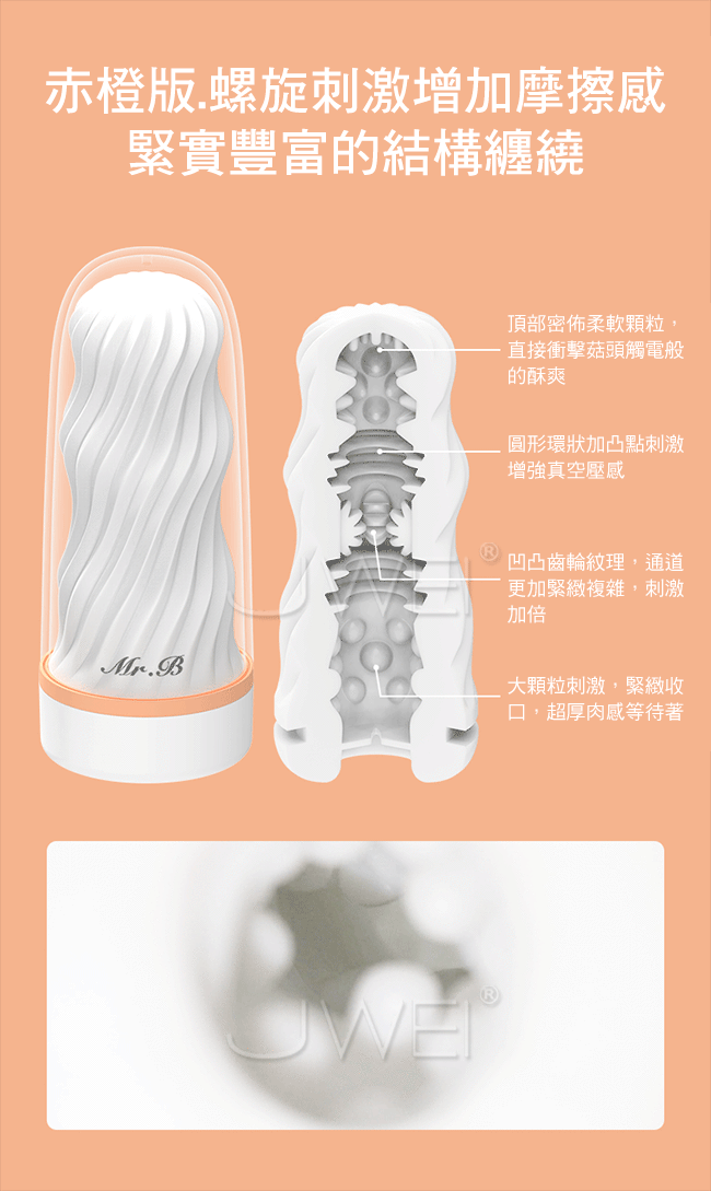 此款可通過氣孔控制氣流,在杯身內形成氣壓緊緊包裹著根部,產生猶如嘴嘬吸般的快感。使用時配合氣孔按壓程度從而達到不同的吸吮效果,輕撩到深處都能體驗到喔~真實還原仿真實肉感通道與紋理,讓每個角度都能俘虜您的身體。