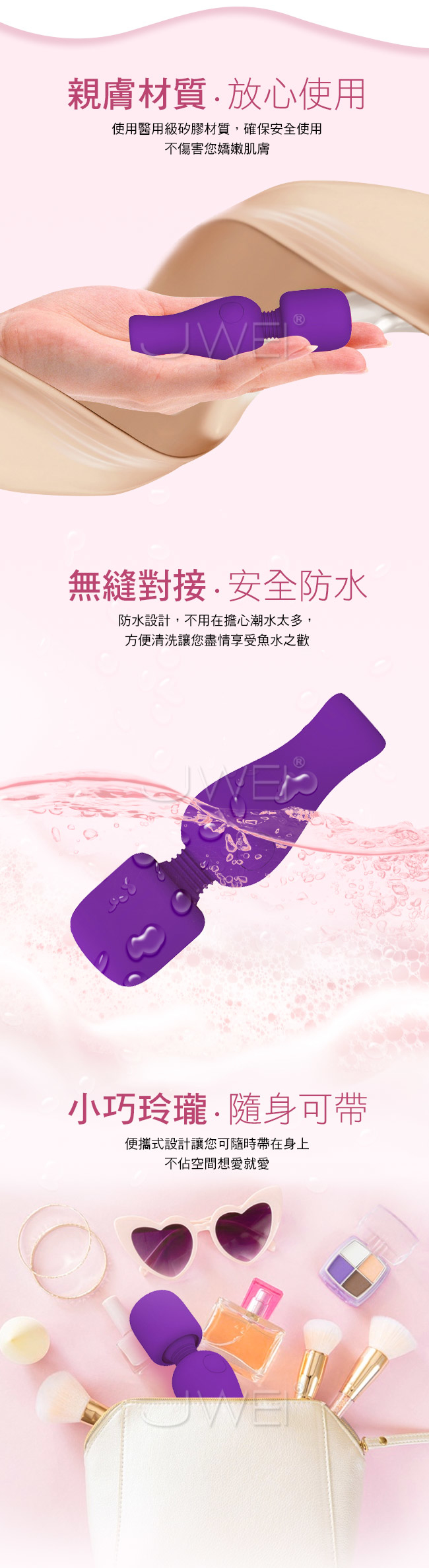 Mini Wand迷你AV按摩棒使用醫用級矽膠材質,確保安全使用不傷害您嬌嫩肌膚。且 完全防水設計,不用在擔心潮水太多,方便清洗讓您盡情享受魚水之歡~此款設計小巧玲瓏讓您可隨時帶在身上不佔空間想愛就愛喔~