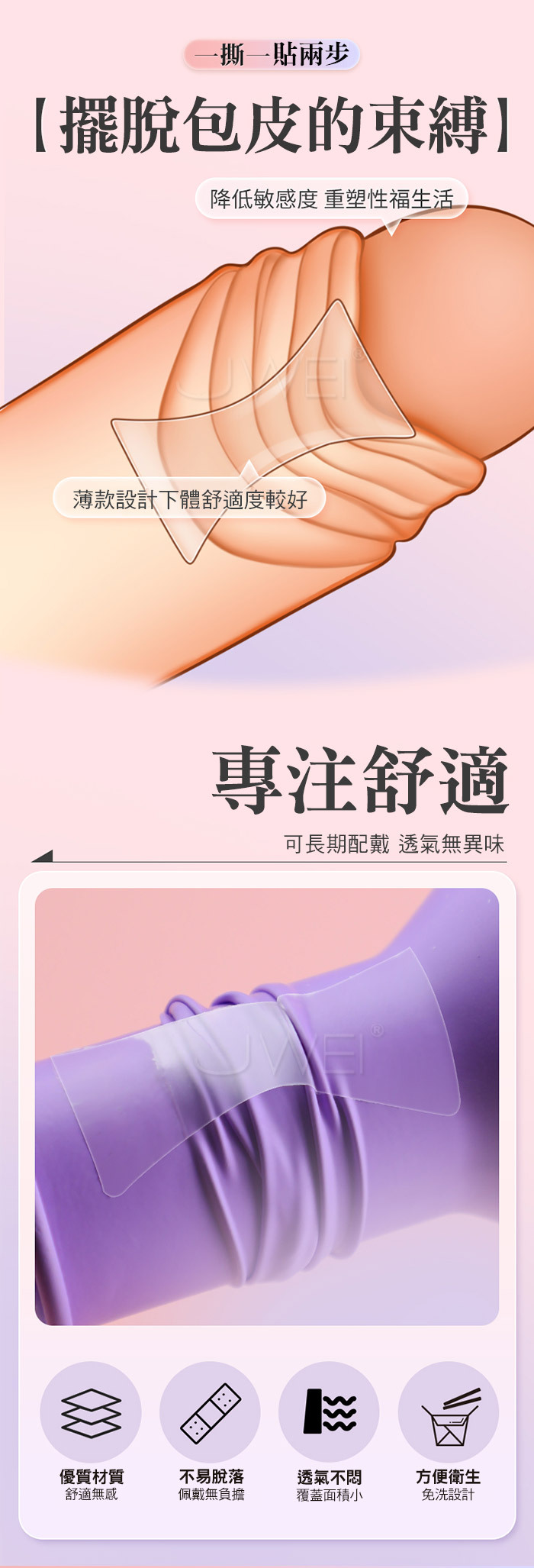 輕鬆進行包皮矯正訓練,阻復貼的設計能輕鬆阻復包皮,降低敏感度,重塑性褔 生活。早安款:白天戴著它運動也不會脫落;晚安款:白天戴著它睡覺也不會脫落 。