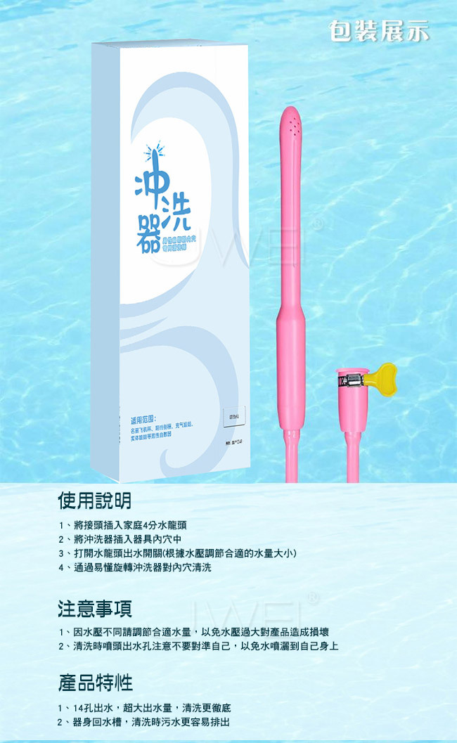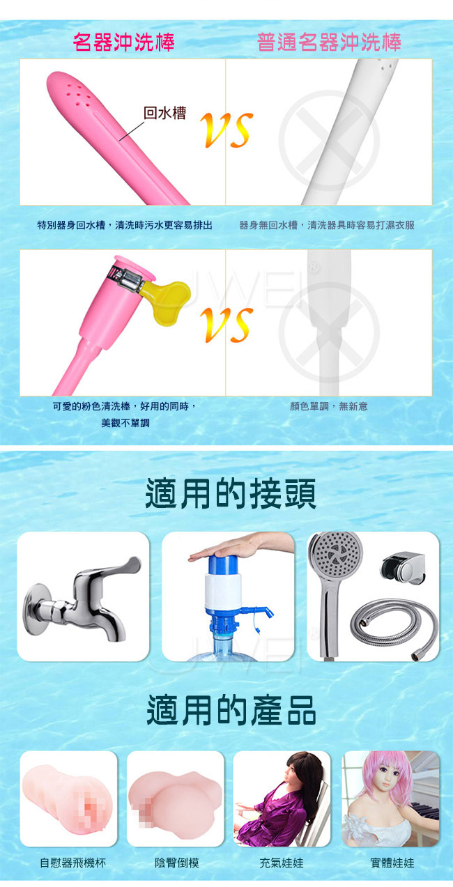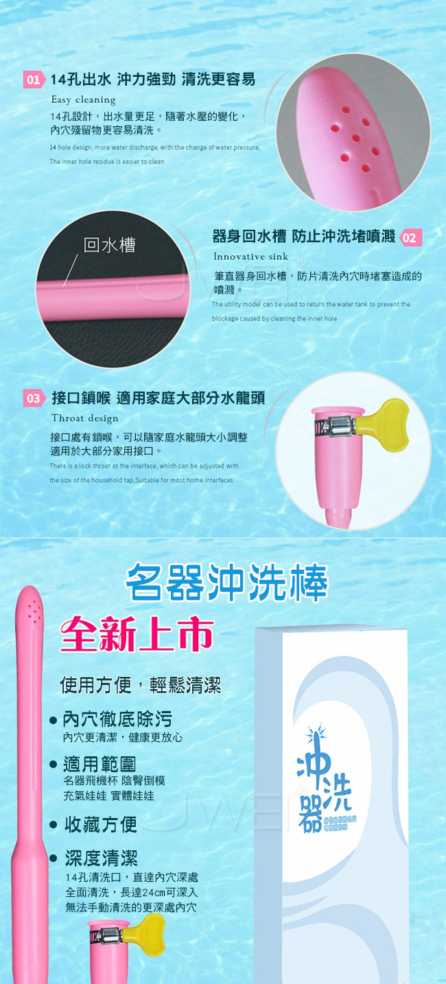 內穴徹底除污,內穴更清潔,健康更放心;深度清潔,14孔出水,沖力強勁 清洗更容易,直達內穴深處;全面清洗,長達24cm可深入,無法手動清洗的更深處內穴;特別器身回水槽,清洗時污水更容易排出。