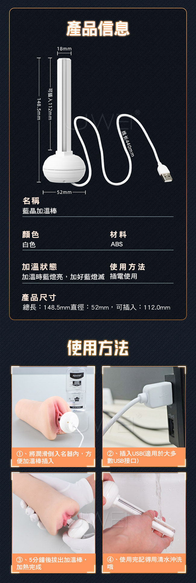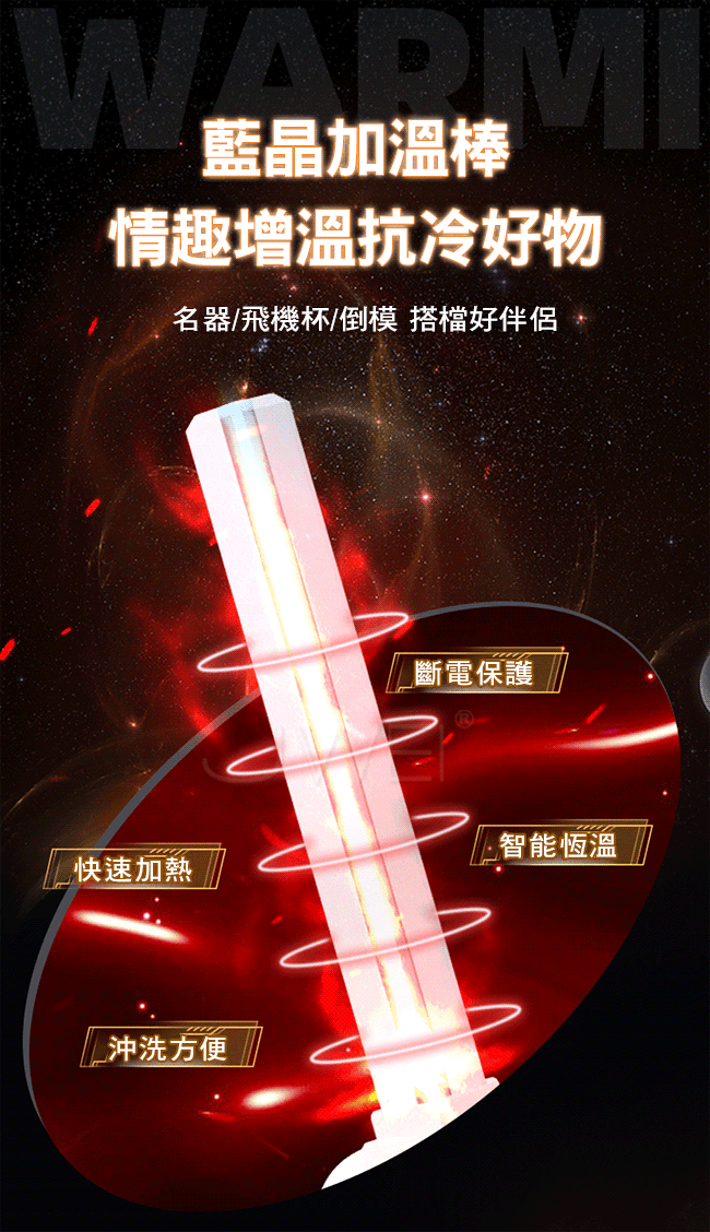藍晶加溫棒,情趣增溫抗冷好物,名器、飛機杯、倒模搭檔好伴侶;深穴加溫,讓你的性福不再冷冰冰,給你暖暖的性福;內置溫控感溫器,加熱保持恆溫熱流湧動,溫度達到一定溫度後自動斷電。