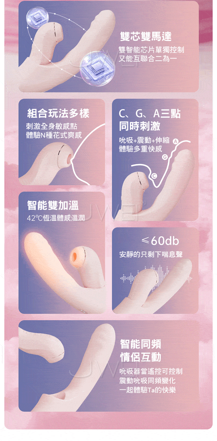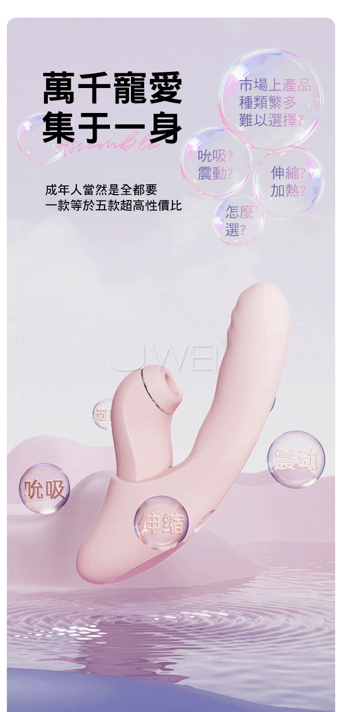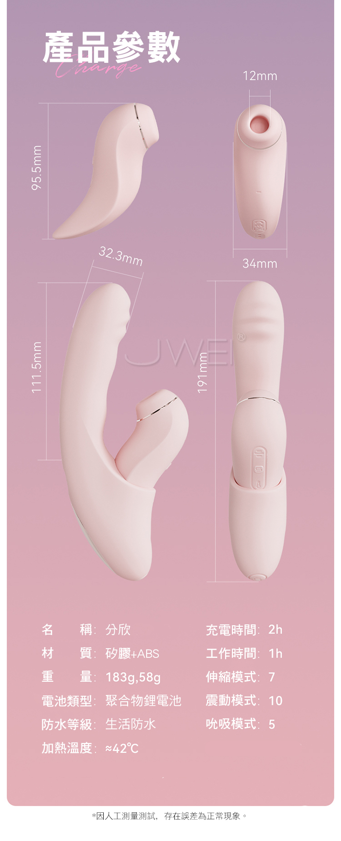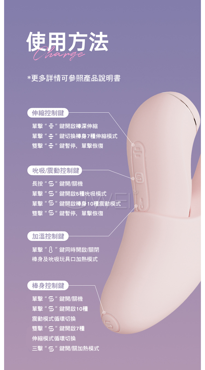 ■功能:10頻酥麻震動、7頻長距離伸縮、脈衝吮吸、智能加溫