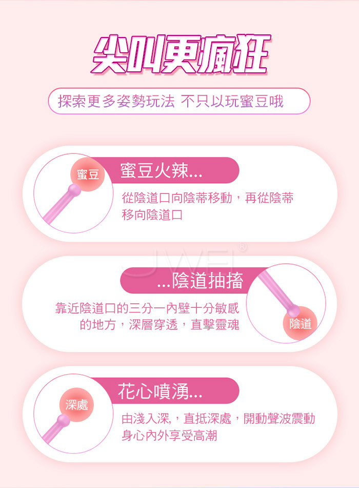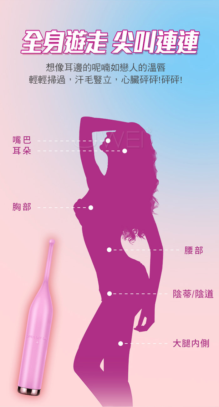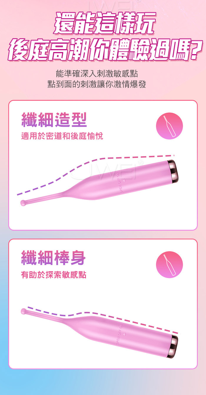 仙女蜜豆棒挑逗新玩法,愛不釋手,敏感探索、單點刺激、美妙前戲;搭配頭套解鎖新玩 法,溫柔顫抖的軟舌刺激比入體帶來的快感還要陶醉;纖細造型,適用於密道和後庭愉悅 ,纖細棒身,有助於探索敏感點;高頻穿透強震,快感秒速引爆,能準確深入刺激敏感點 ,點到面的刺激讓你激情爆發,探索更多姿勢玩法不只以玩蜜豆哦!全身遊走尖叫連連,想 像耳邊的呢喃如戀人的溫唇,輕輕掃過,汗毛豎立,心臟砰砰!砰砰!體型輕巧便於攜帶,如 電動牙刷大小,輕鬆放在化妝包裡,帶去哪裡都可以~
