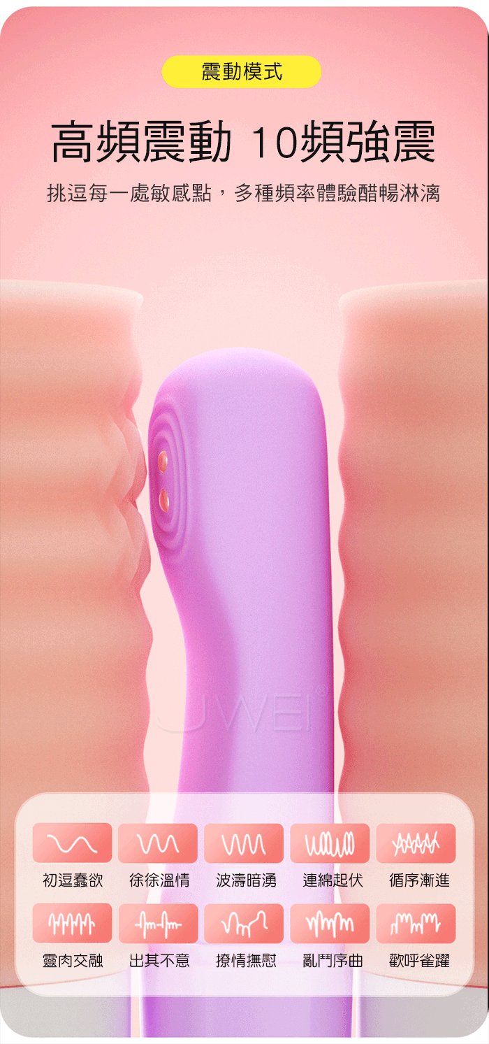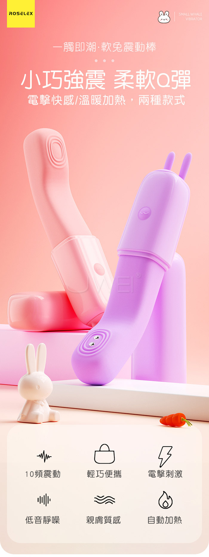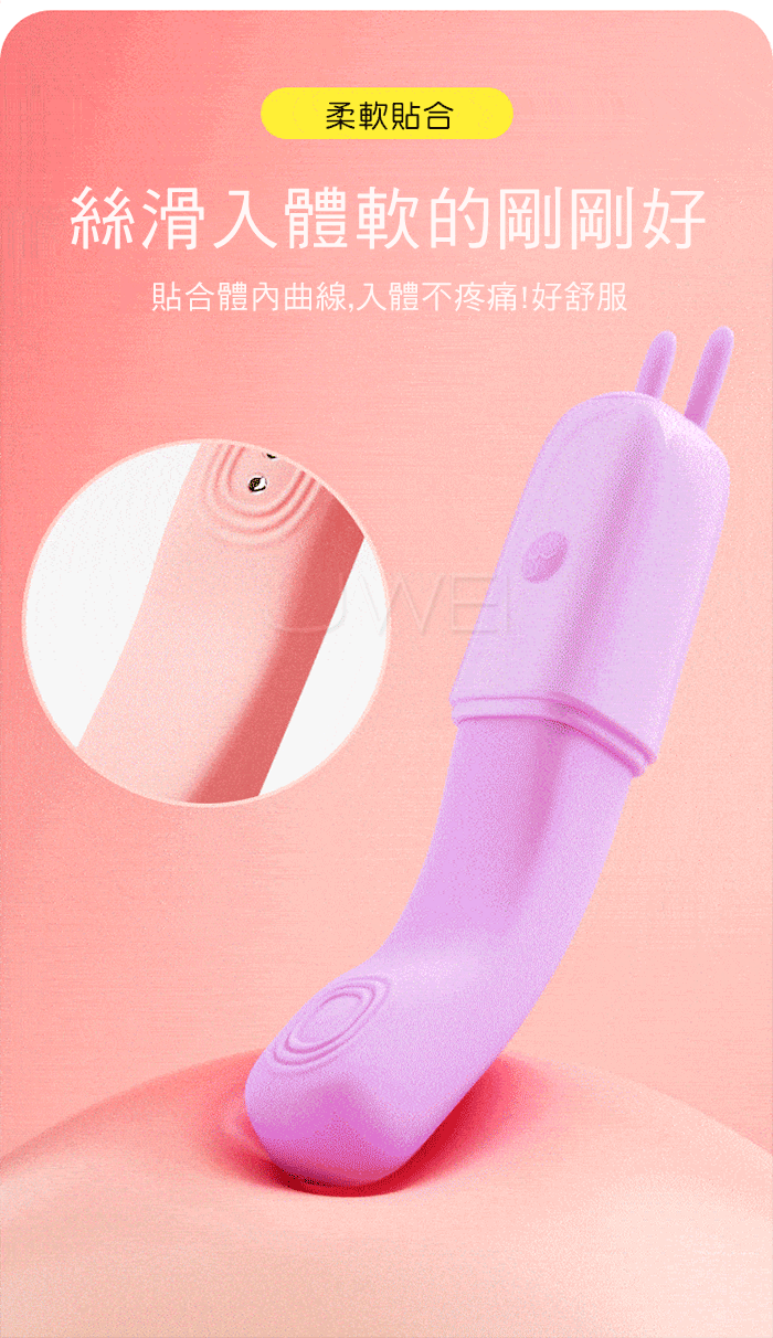一觸即潮,軟兔震動棒,小巧強震,柔軟Q彈;電擊高潮,電擊強度自 由調節,低頻電流,敏感部位在電流刺激下酥酥麻麻,不由自主收縮震 顫,刺激更強烈;高頻10頻震動,挑逗每一處敏感點,多種頻率體驗 醋暢淋漓;輕巧便攜,調情玩法,令人雀躍的情趣擔當,如尋寶般觸及 每個敏感點,酥麻感遍布全身;親膚質感,柔軟貼合,絲滑入體軟的剛 剛好, 貼合體內曲線,入體不疼痛,好舒服!