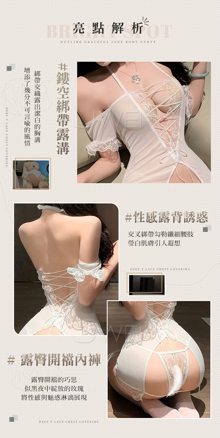誘情透視.鏤空露溝裸臀透視睡裙【洋裝+開襠內褲+長筒絲襪】白