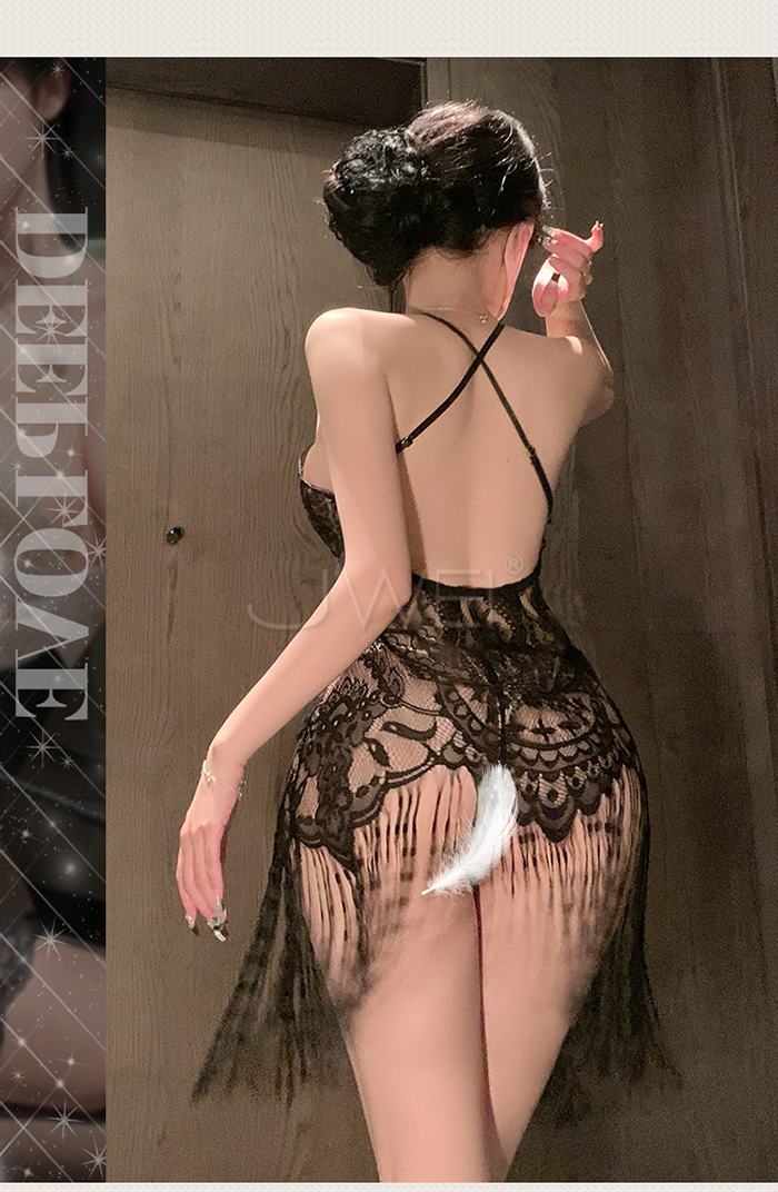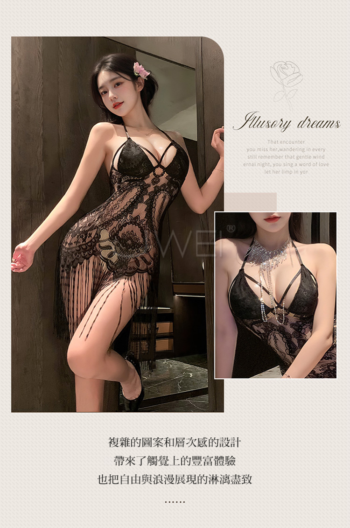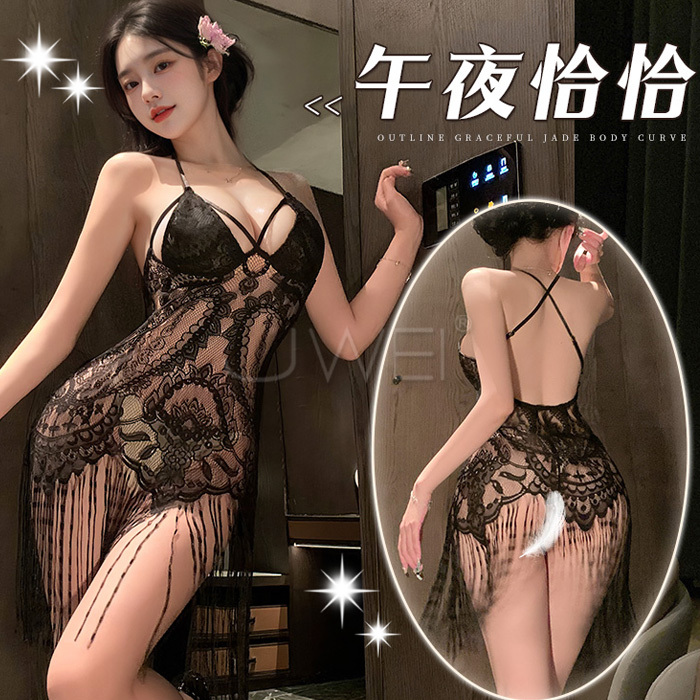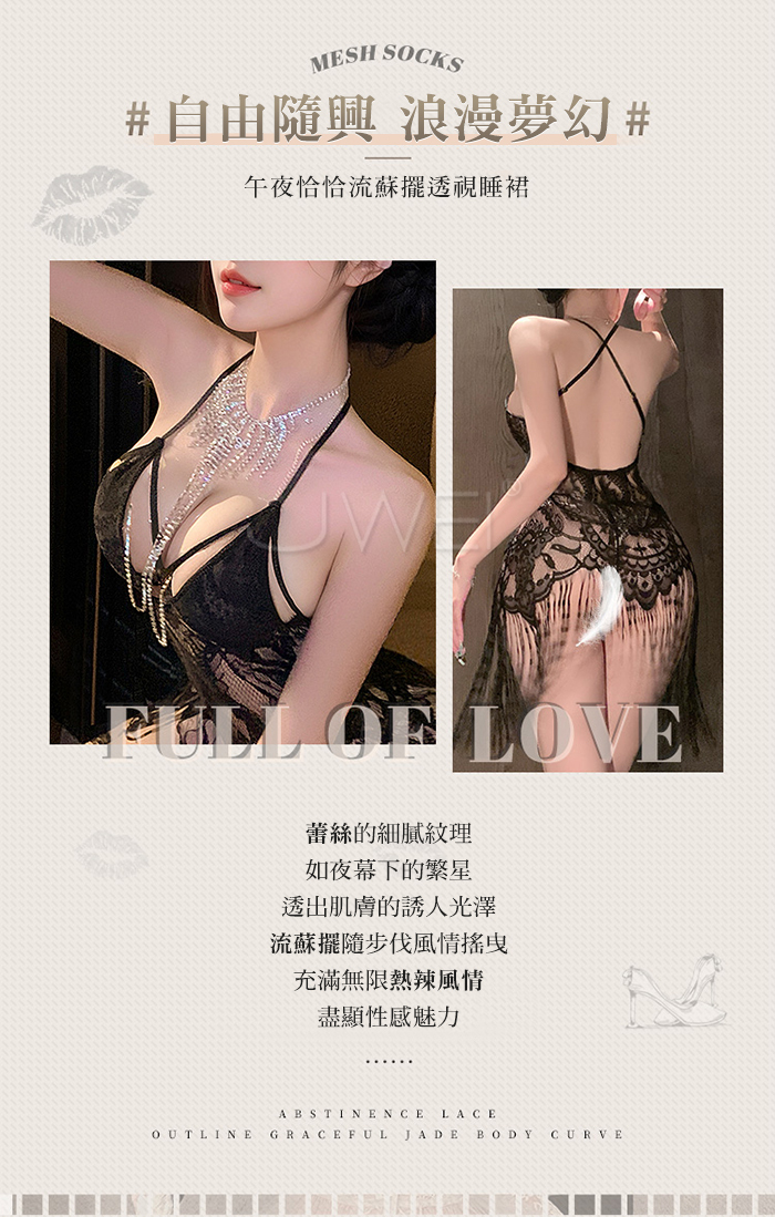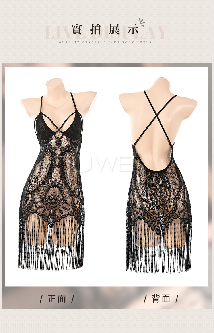 午夜恰恰.性感鏤空美背風情流蘇裙擺透視睡裙【透視睡裙+T褲】