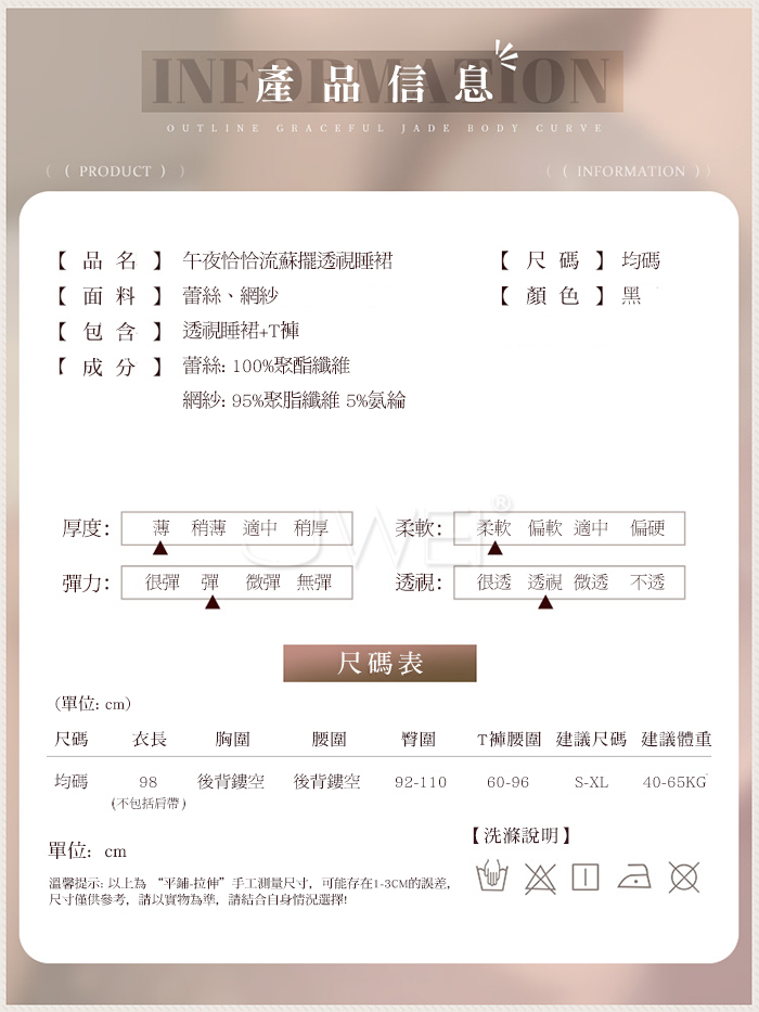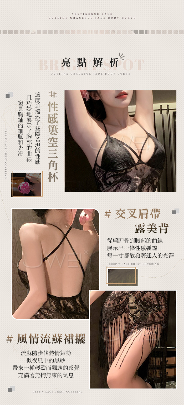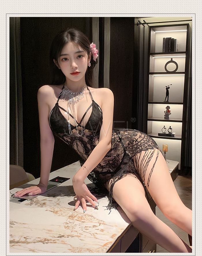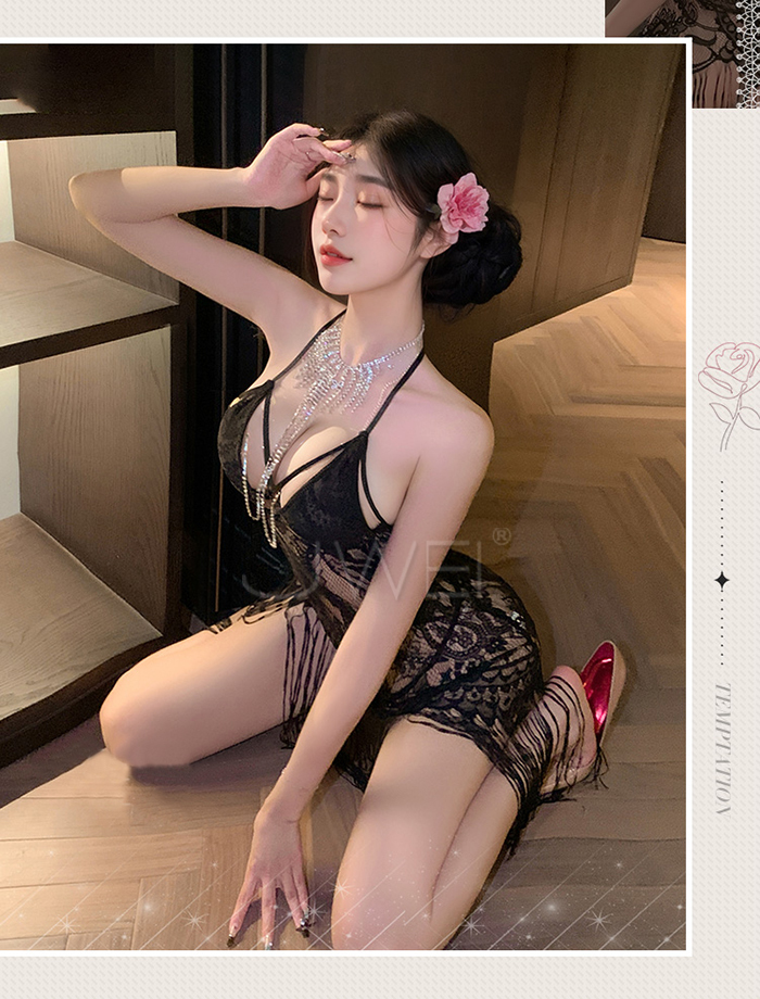 午夜恰恰.性感鏤空美背風情流蘇裙擺透視睡裙【透視睡裙+T褲】