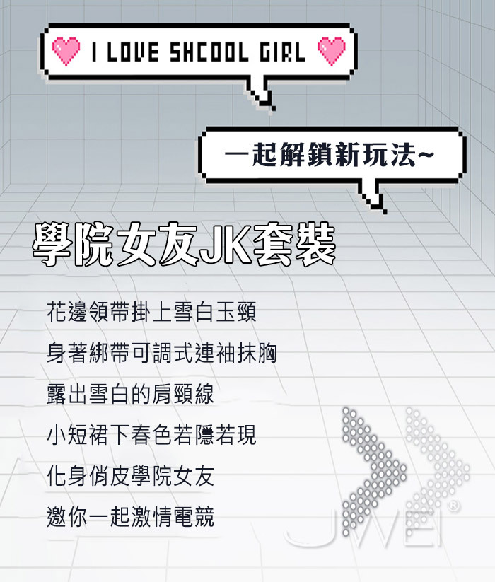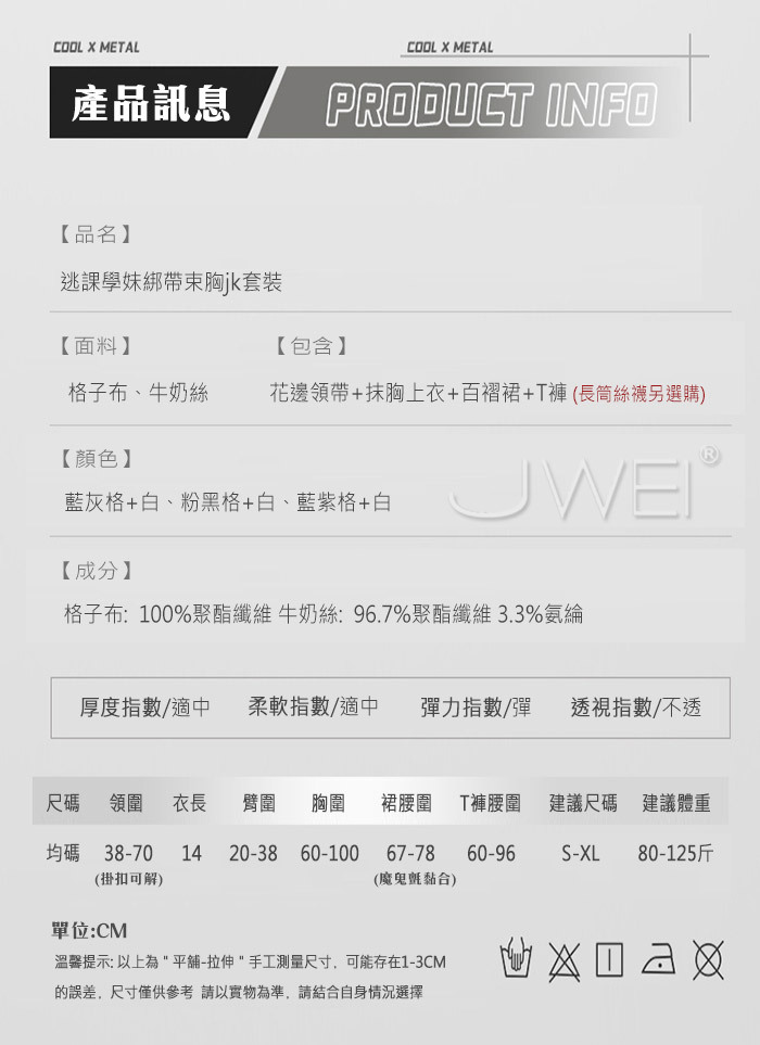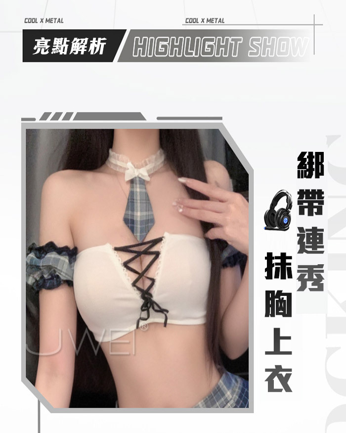 ■內容物:花邊領帶+抹胸上衣+百褶裙+T褲(長筒絲襪另選購)