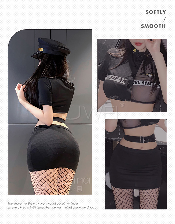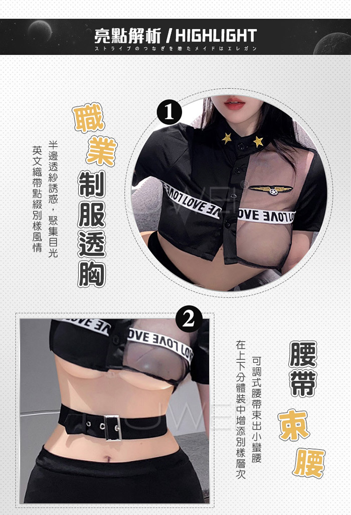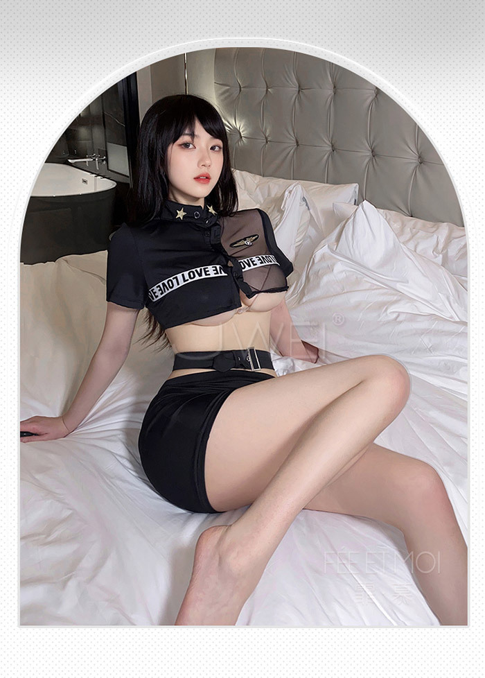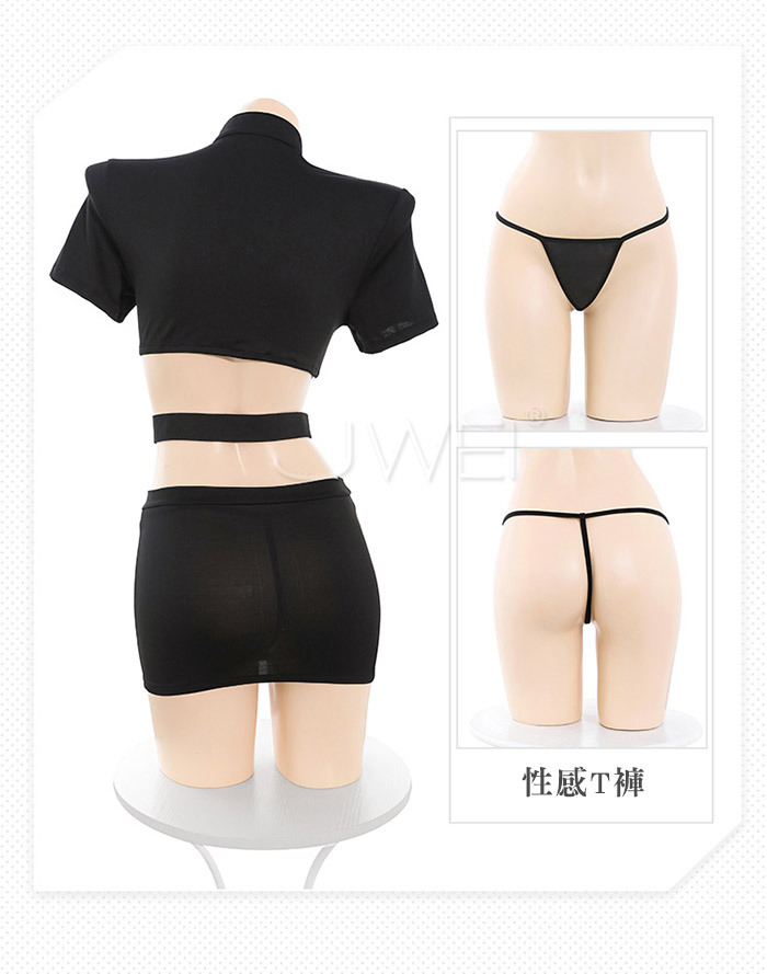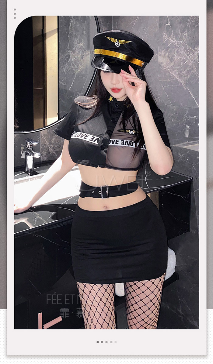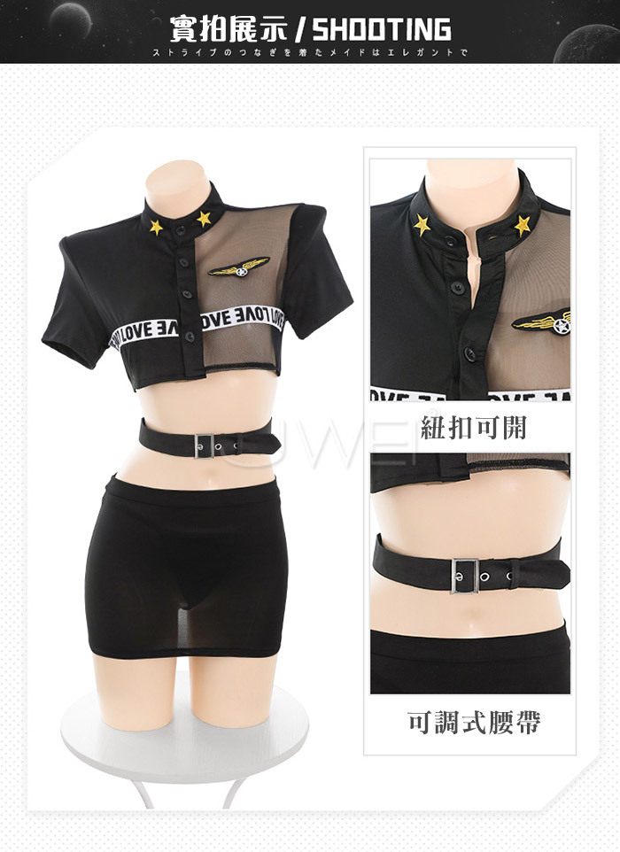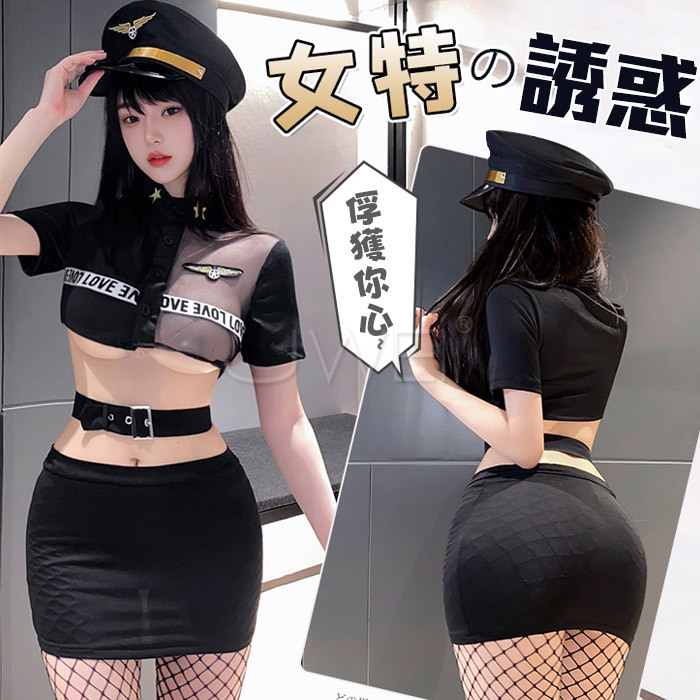 實習女特.網紗拼接透胸教官套裝【上衣 腰帶 裙子 T褲】