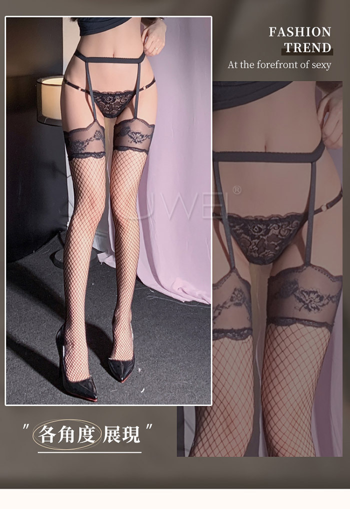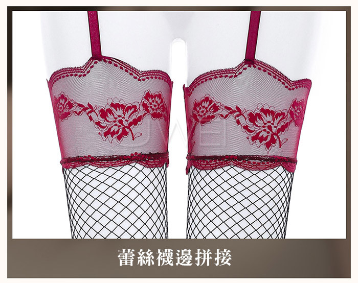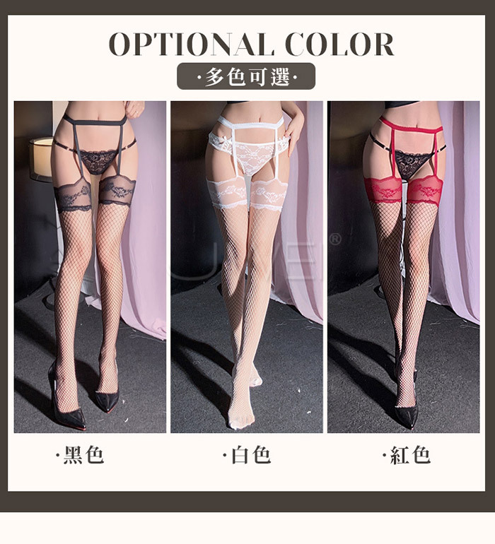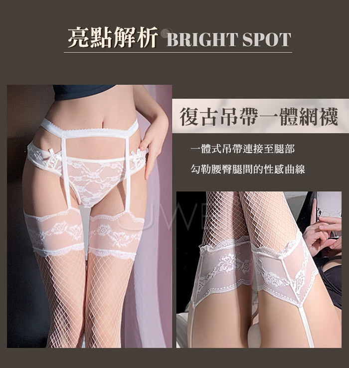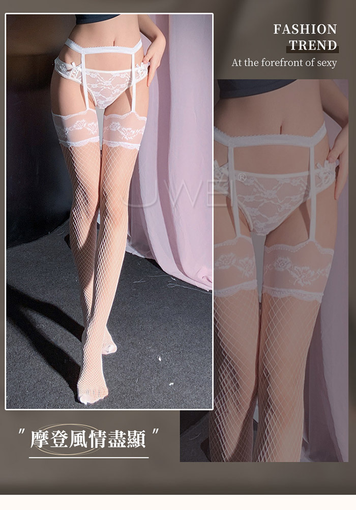 誘愛情網.法式蕾絲花邊連腰吊帶一體網襪-白