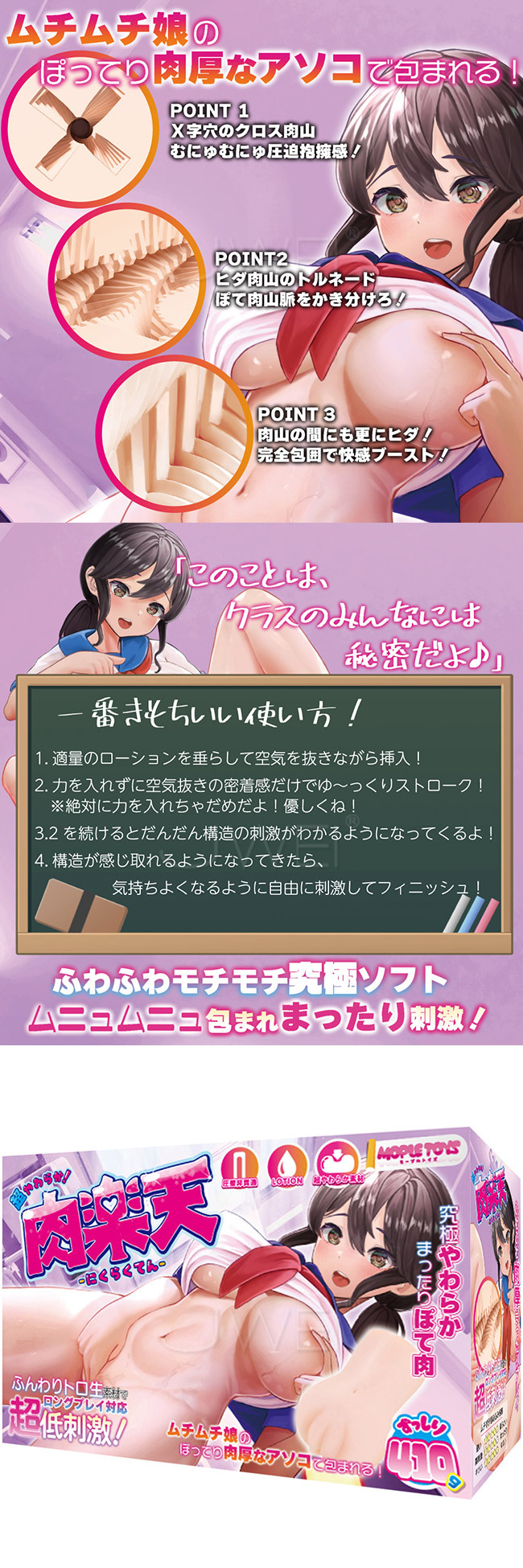 優しく包み込む超低刺激のふんわりトロ生素材でまったりロングプレイを楽しもう!モープルトイズが提案する、超柔らか素材でのまったりロングプレイ!とろけるようなトロ生素材を採用した肉楽天は、動かさなくても410gの自重でねっとりと吸い込むように包み込んできます。内部は×字型にそびえる肉ヒダに細かく横ヒダを刻んだ、とことんまで柔らかいヒダを楽しめる快楽構造。低刺激でもゆっくり確実に射精感を煽ります。また、超ソフトな素材なので空気抜き時の密着感も非常に高いです。