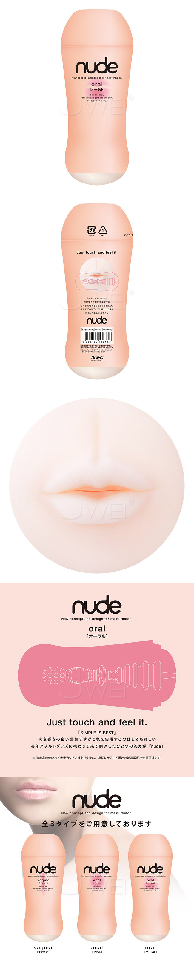 「SIMPLE IS BEST」大変響きの良い言葉ですが、これを実現するのはとても難しい!長年アダルトグッズに携わって来て到達したひとつの答えが「nude」オナホールの原点、オナカップの源流を徹底追求。ぷるぷるの唇が卑猥な「オーラル」は挿入口付近の横ヒダで舌のザラザラ感を、さらに中腹と奥は大きなコブで口蓋垂と咽頭を表現し、リアルなオーラルセックスを体感頂けます。「ヴァギナ」「アナル」「オーラル」の3種同時発売!オナホ童貞から違いのわかるオナホラーまで、全てのオナリストへの「SIMPLE IS BEST」です。お好きなプレイで選ぶもよし、3つ揃えて日替わりで楽しむもオススメです。