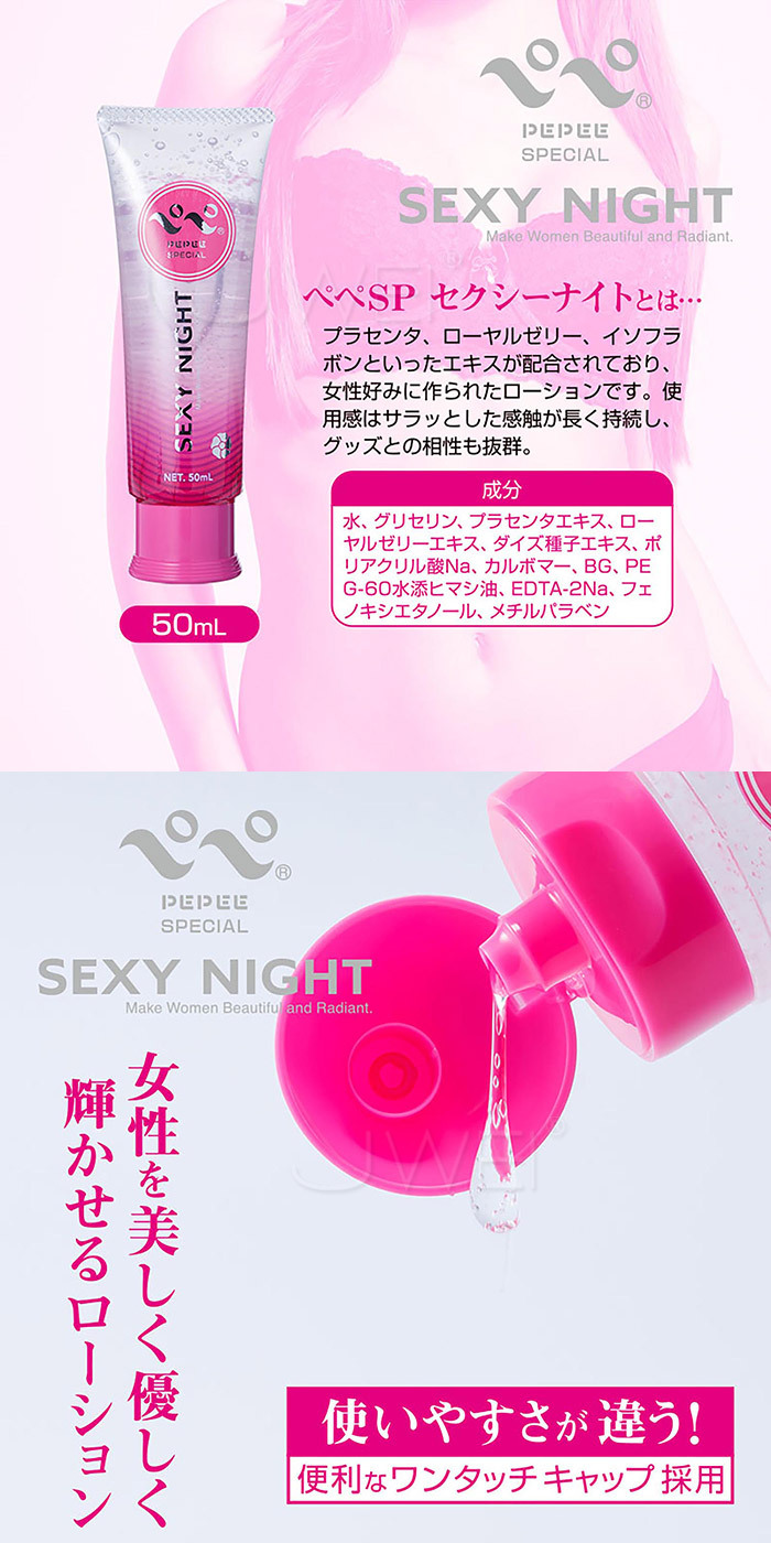 Pepe Special sexy Night 是一款專為女性口味而設計的潤滑液,含有胎盤、蜂王乳和異黃酮等萃取物。