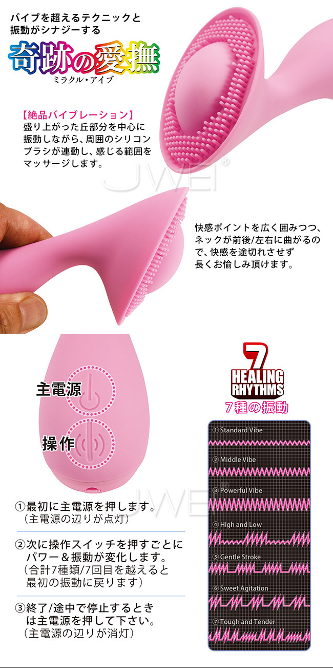 快感エリアを囲んでフィット!癒しながら…絶頂までをサポートする新感覚の癒し系快感バイブレーターで、独特な形状がよく見かけるバイブレータを超越するテクニック&振動のシナジー効果をプラス。くねくね曲がるネックが、快感ポイントを的確にとらえてはなしません。盛り上がった丘部分を中心にブラシが刺激します。