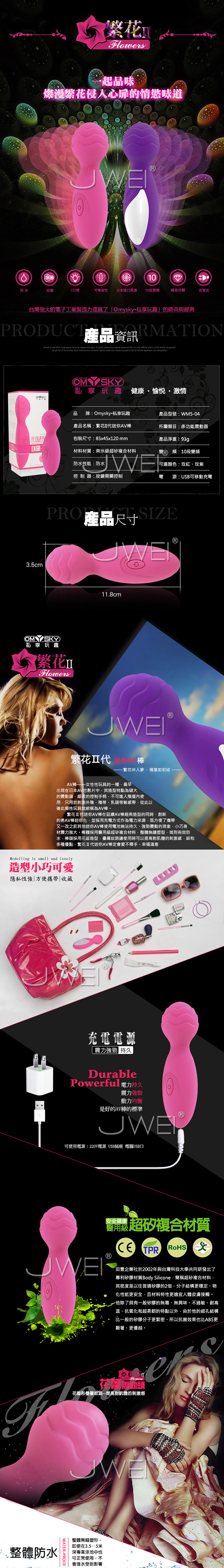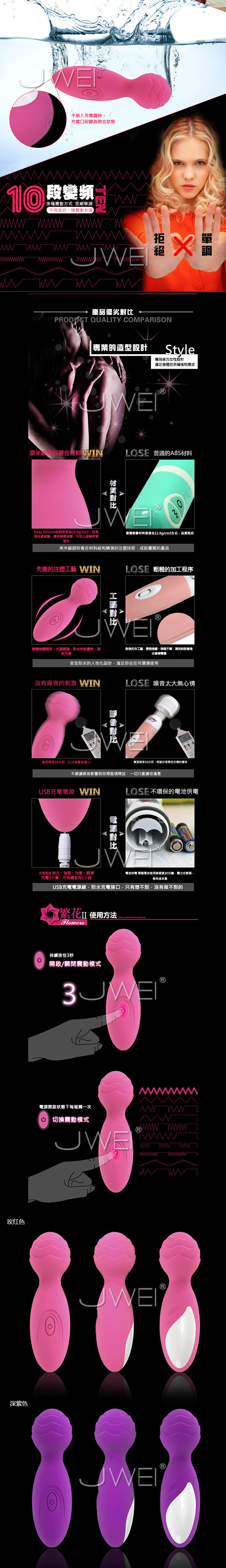 繁花 II 代迷你AV棒在延續AV棒經典造型的同時,創新 的將AV棒迷你化,並採用充電方式作為電力來源,既方便了攜帶 又一改之前其他迷你AV棒使用電池無法持久、強勁震動的現象,小巧身 材震力強大。棒體採用醫用級超矽複合材料,整體無縫塑型,做到有效防 水,棒頭採用花蕊造型,疊層紋路讓使用時可以提高對肌體的刺激感,綜和 多種優點,繁花 II 代迷你AV棒定會愛不釋手、幸福滿意!