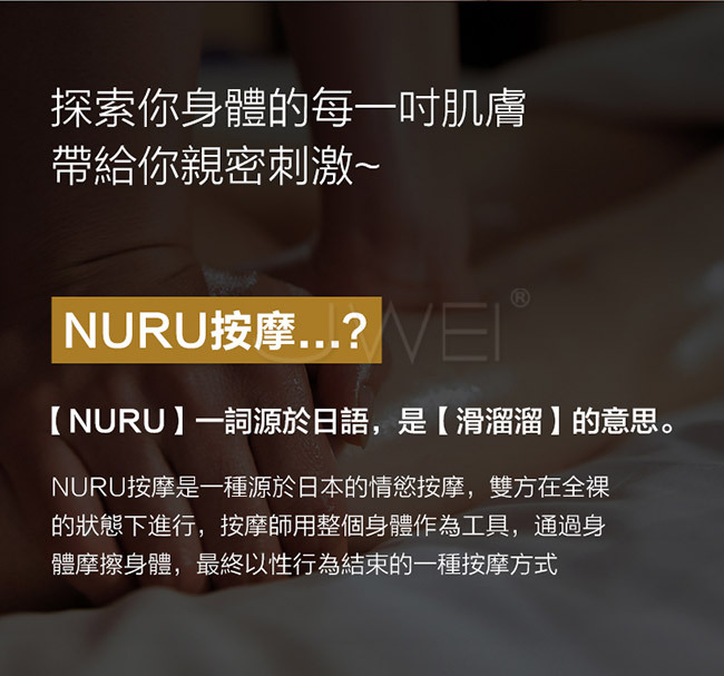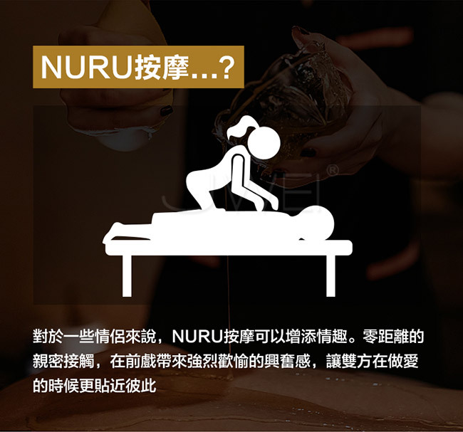 NURU滑溜溜情趣按摩凝膠,超順滑不油膩,成分自然不易過敏,高品質歐洲進口海藻成分帶來 【滑溜溜】親密接觸,觸感非常絲滑、低敏無色無味,不用兌水直接就可以使用。NURU按摩可 以增添情趣,零距離的親密接觸,在前戲帶來強烈歡愉的興奮感,讓雙方在做愛的時候更貼近彼 此。超滑型-藻類提取物濃度更高,能夠帶來更長時間的的親密接觸的同時,能夠保持肌膚彈性。