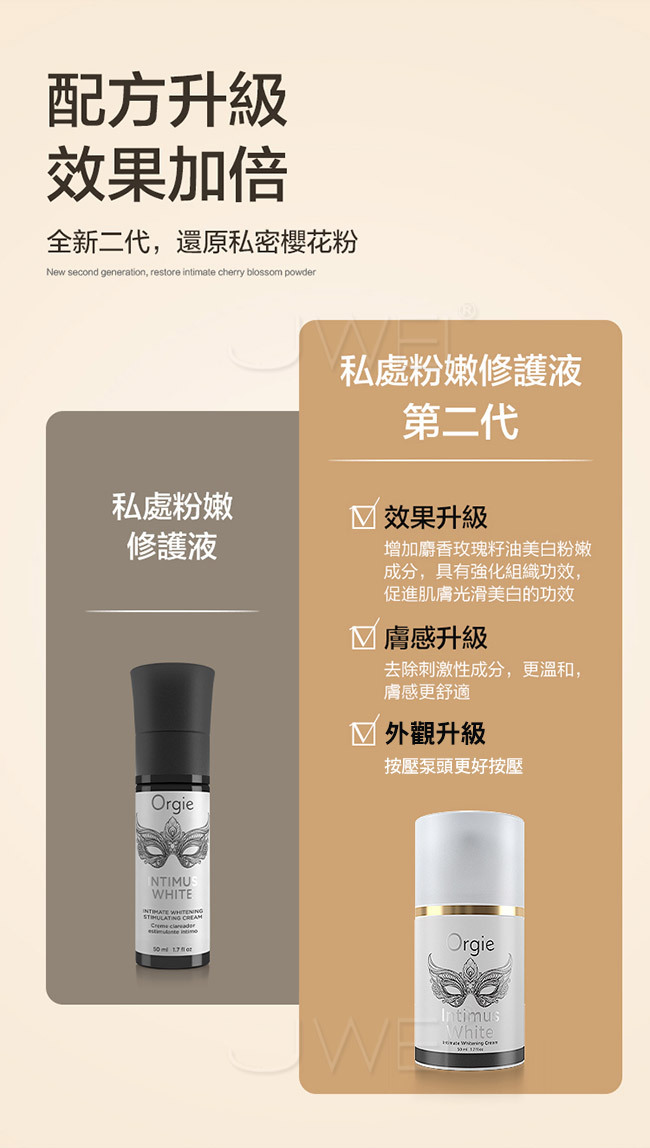 效果升級,增加麝香玫瑰籽油美白粉嫩成分,具有強化組織功效,促進肌膚光滑美白的功效;膚感升級,去除刺激性成分,更溫和、膚感更舒適;外觀升級,按壓泵頭更好按壓。堅持每天使用,私密粉嫩看得見,抑黑力-抑制黑色素沉澱,根源祛黑;粉嫩力-淡化私密黑色素沉澱,提亮粉嫩;滋潤力-加強正常水合功能,滋潤肌膚。