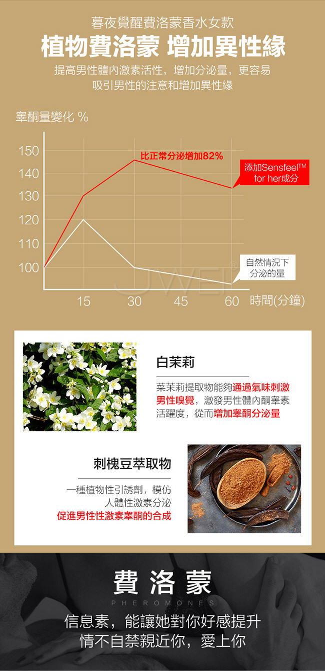 植物費洛蒙成分,隨手一噴魅力加分,誘發體內費洛蒙激素多倍增長,增加個人魅力,讓異性對 你的好感幾倍增長,讓你輕鬆吸引TA的注意。空氣中飄散著你誘人的氣息,TA的每一次呼吸都 充斥著你的味道,讓TA不知不覺中陷入你的“氣味陷阱”愛上你。