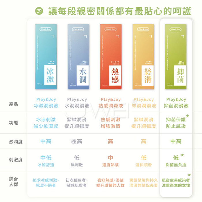 集安全、呵護、樂趣三合一的極致潤滑液!讓您,用過就愛上!極致潤滑 液採用PH5.5弱酸性與女性天然分泌液相近的特殊配方,使私密處保持 最佳狀態不產生惱人的異味或乾養不殊服!!並且擁有藍藻玻尿酸底液不 但兼具保養功能更能讓潤滑液有著Q彈感受喔~PLAY & JOY極致潤滑 液擁有化妝品等級保養品鎖水磁石可以長效潤滑,讓您樂趣不間斷~乾 燥後只需少量水份即可重現潤滑效果。清爽水溶性配方,無色無味。只 需簡單清水就可方便清洗無異味殘留~抑菌型潤滑液還擁有天然抑菌成 份採用繡線菊萃取成份來達成自然非化學抑菌效果杜絕異味產生喔~