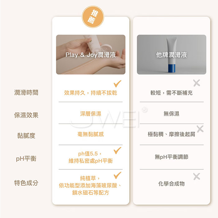 集安全、呵護、樂趣三合一的極致潤滑液!讓您,用過就愛上!極致潤滑 液採用PH5.5弱酸性與女性天然分泌液相近的特殊配方,使私密處保持 最佳狀態不產生惱人的異味或乾養不殊服!!並且擁有藍藻玻尿酸底液不 但兼具保養功能更能讓潤滑液有著Q彈感受喔~PLAY & JOY極致潤滑 液擁有化妝品等級保養品鎖水磁石可以長效潤滑,讓您樂趣不間斷~乾 燥後只需少量水份即可重現潤滑效果。清爽水溶性配方,無色無味。只 需簡單清水就可方便清洗無異味殘留~熱感型添加天然瑪卡萃取物,以 自然方式產生熱感使您感官刺激情趣直上雲霄~