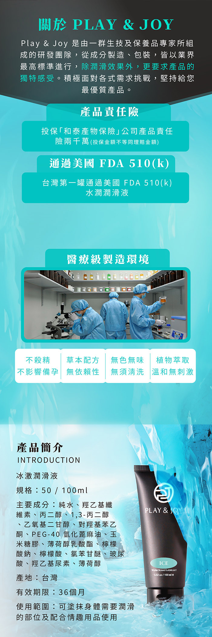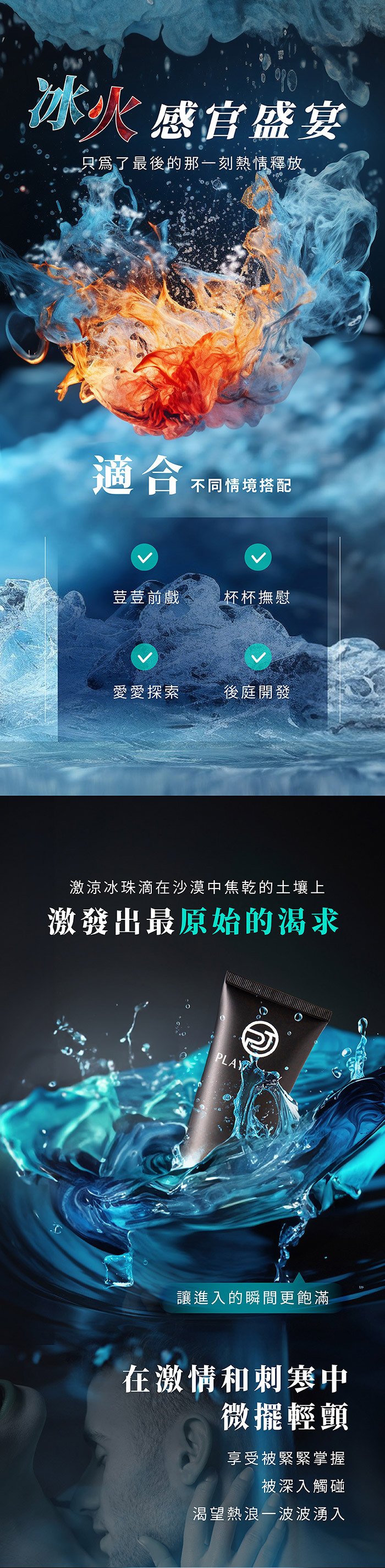 冰激潤滑液,冰點到沸點的極致碰撞,冰中帶火感受每一滴的刺激,揭 開冰冷表面下,令人血脈噴張的火辣,冰激凍感,感受每一寸肌膚上的 冰熱衝擊,冰火感官盛刻,只為了最後的那一刻熱情釋放,激涼冰珠滴 在沙漠中焦乾的土壤上,激發出最原始的渴求,讓你欲罷不能,感受另 一半的濕緊包覆!